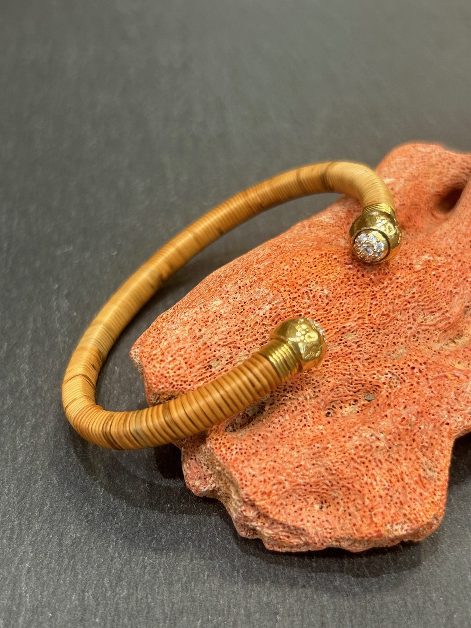 Bracelet Sari emballé, bracelet jonc rigide ouvert en acétate emballé d’osier, habillé de fils dorés, se terminant à ses extrémités par 2 cabochons strassés dorés à l’or fin..
