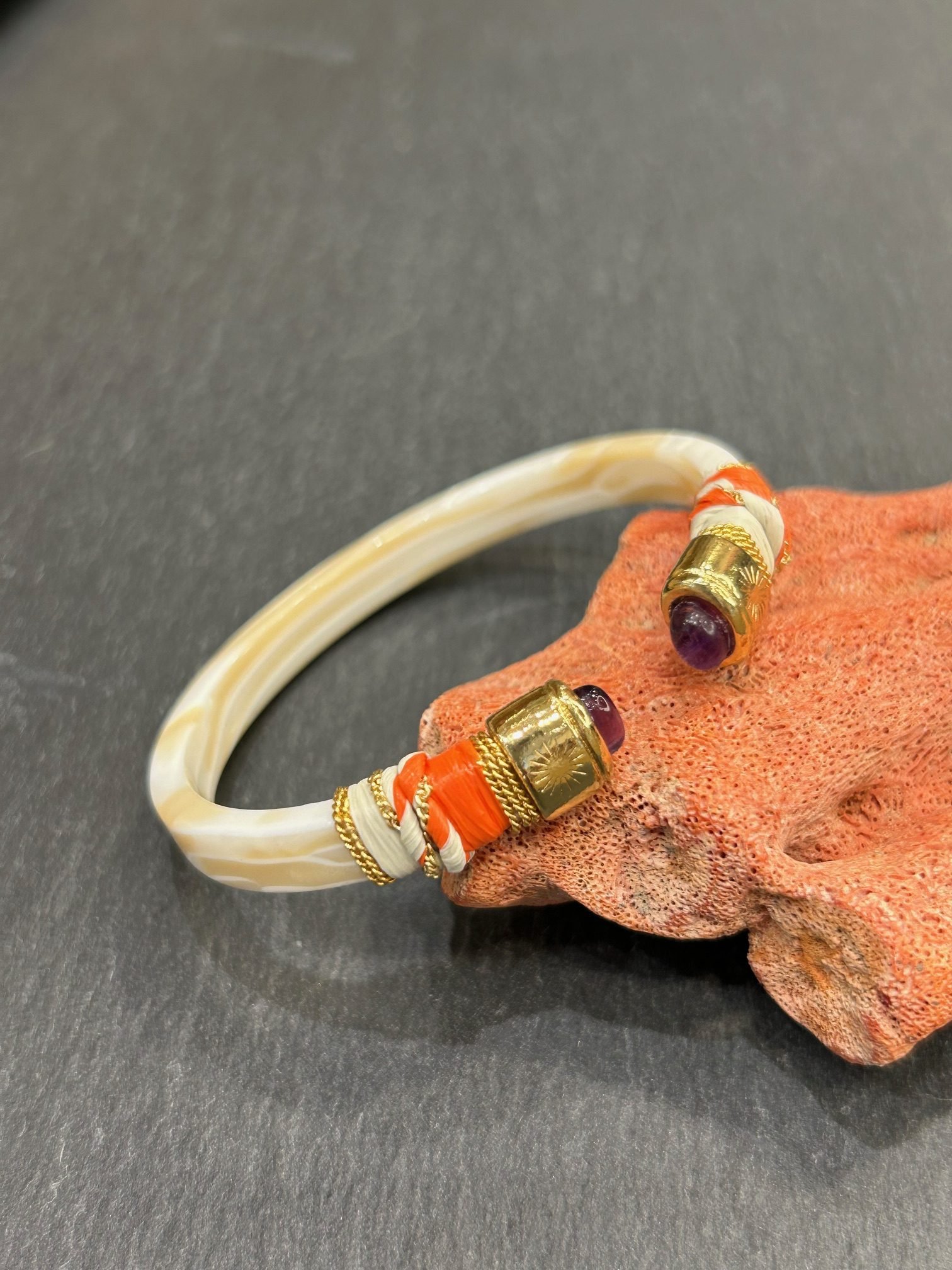 Bracelet Sarina, bracelet jonc rigide ouvert en acétate coloris ivoire, habillé de fils dorés, orange fluo et ivoire, se terminant à ses extrémités par 2 cabochons violet, dorés à l’or fin.