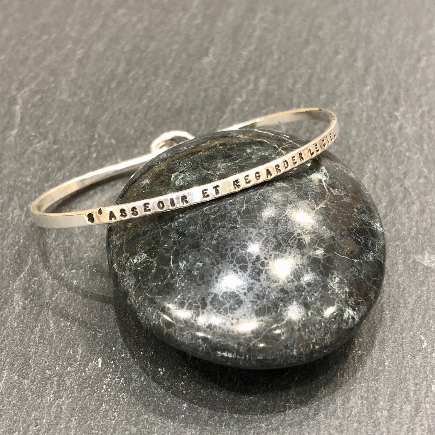 Bracelet jonc fermé en argent gravé : « S’asseoir et regarder le ciel. »