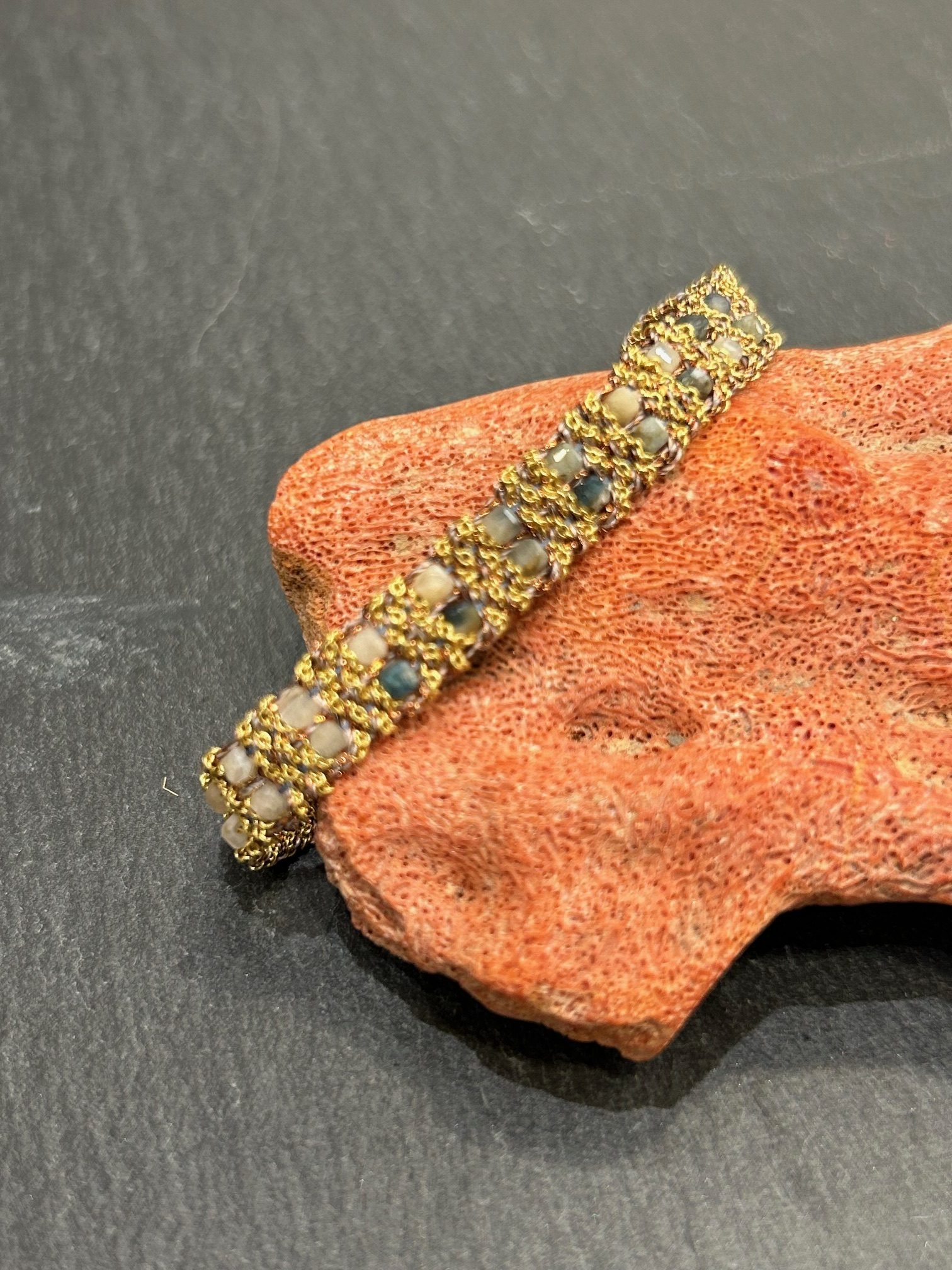Bracelet tissé en argent 925 paqué or orné de 2 rangs de pierres semi précieuse tourmaline bleue.