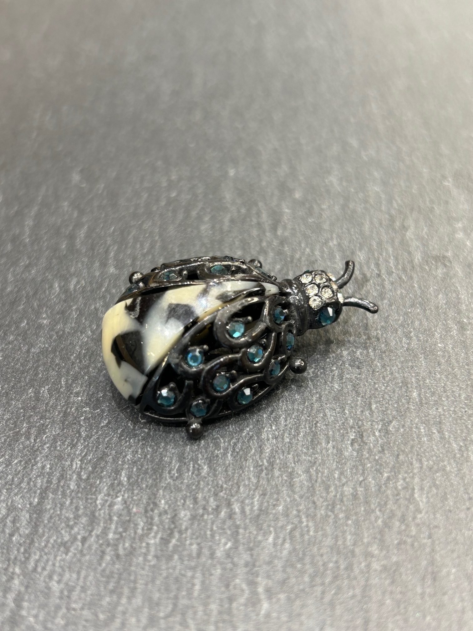 Broche Coccinelle en métal noir toute habillée de strass bleu, corps en acétate gris et noir.