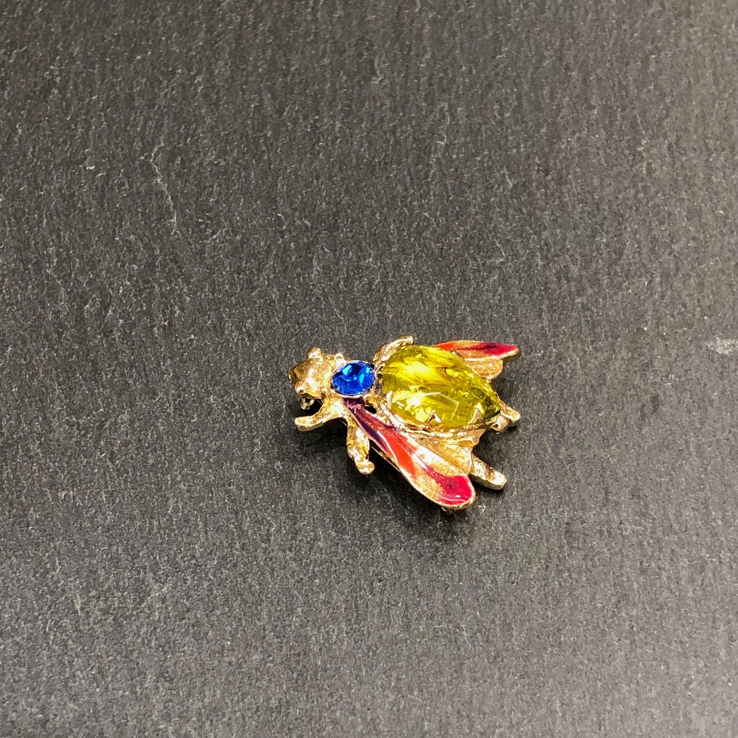 Broche mouche dorée à l’or fin ornée d’un cabochon vert jaune et d’un swarovski bleu, les ailes sont finement émaillées.