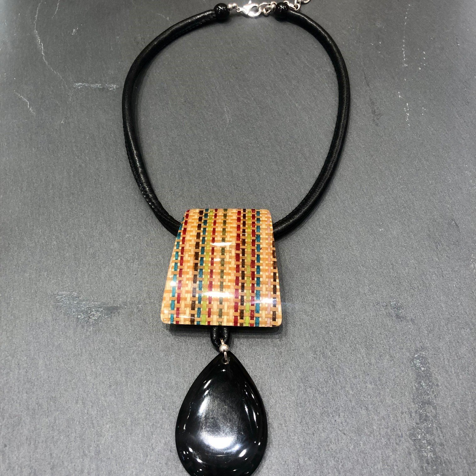Collier court orné d’une pièce en tressage de bambou sous résine et goutte de corne, tour en cuir