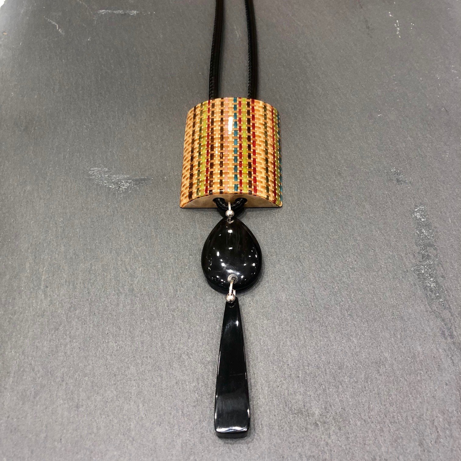 Collier long orné d’une pièce en tressage de bambou sous résine suivi de pièces en corne, tour en cuir