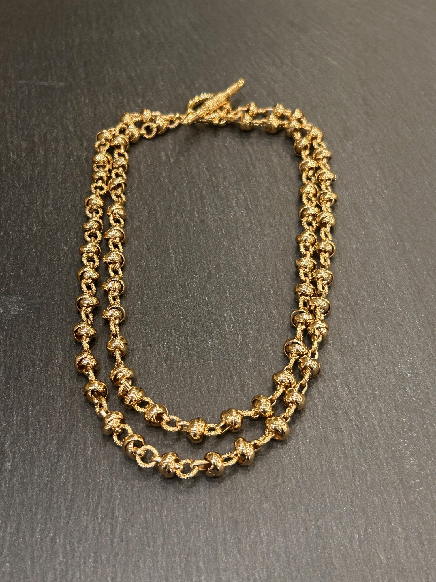 Ce bijou révèle un travail artisanal minutieux. L’étain plaqué or diffuse une lumière chaude et douce. De plus, les maillons alternent entre surfaces lisses et gravées. Ils offrent un contraste visuel harmonieux. Par ailleurs, cette combinaison donne du caractère sans alourdir la silhouette.