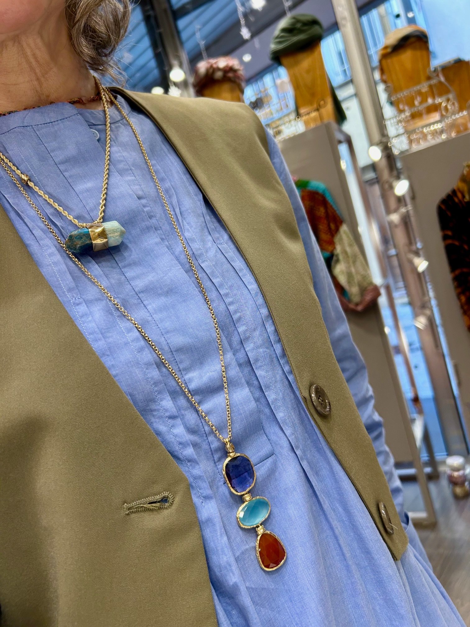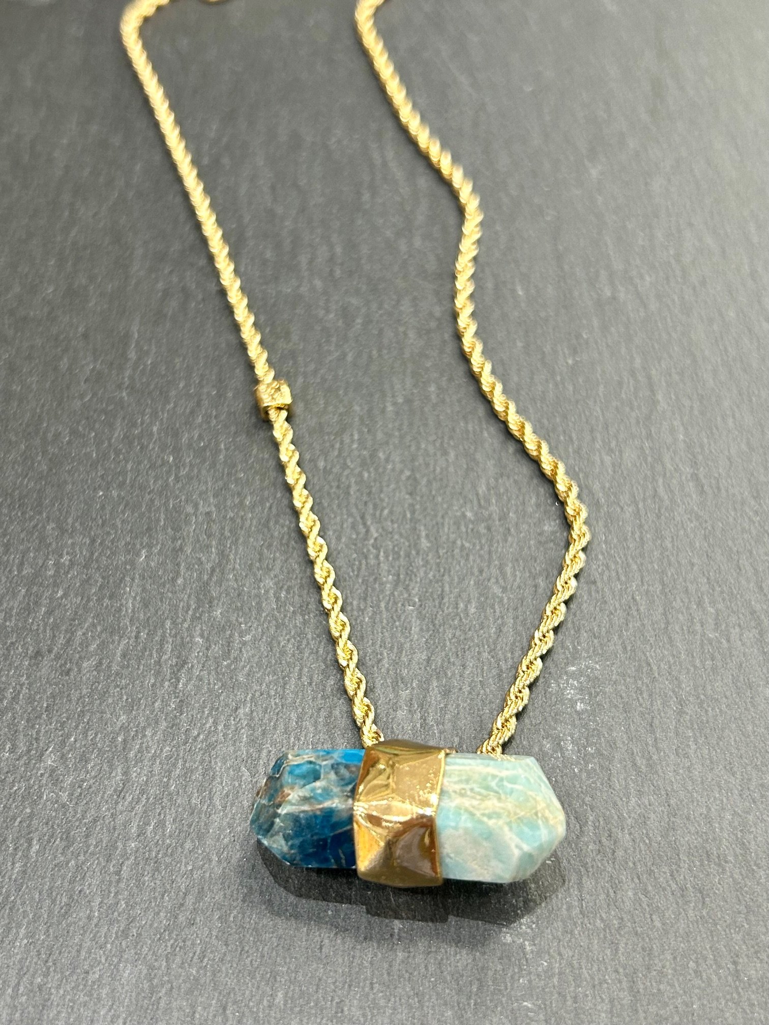 Collier court doré à l’or fin 24 carats chaine serpentée orné d’un pendentif composé de deux délicates pierres semi précieuse brutes apatite / calcite bleue.