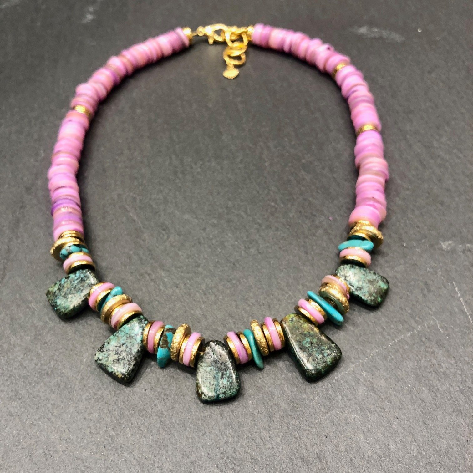 Collier court en coquillage parme orné de 5 pampilles en turquoise africaine.