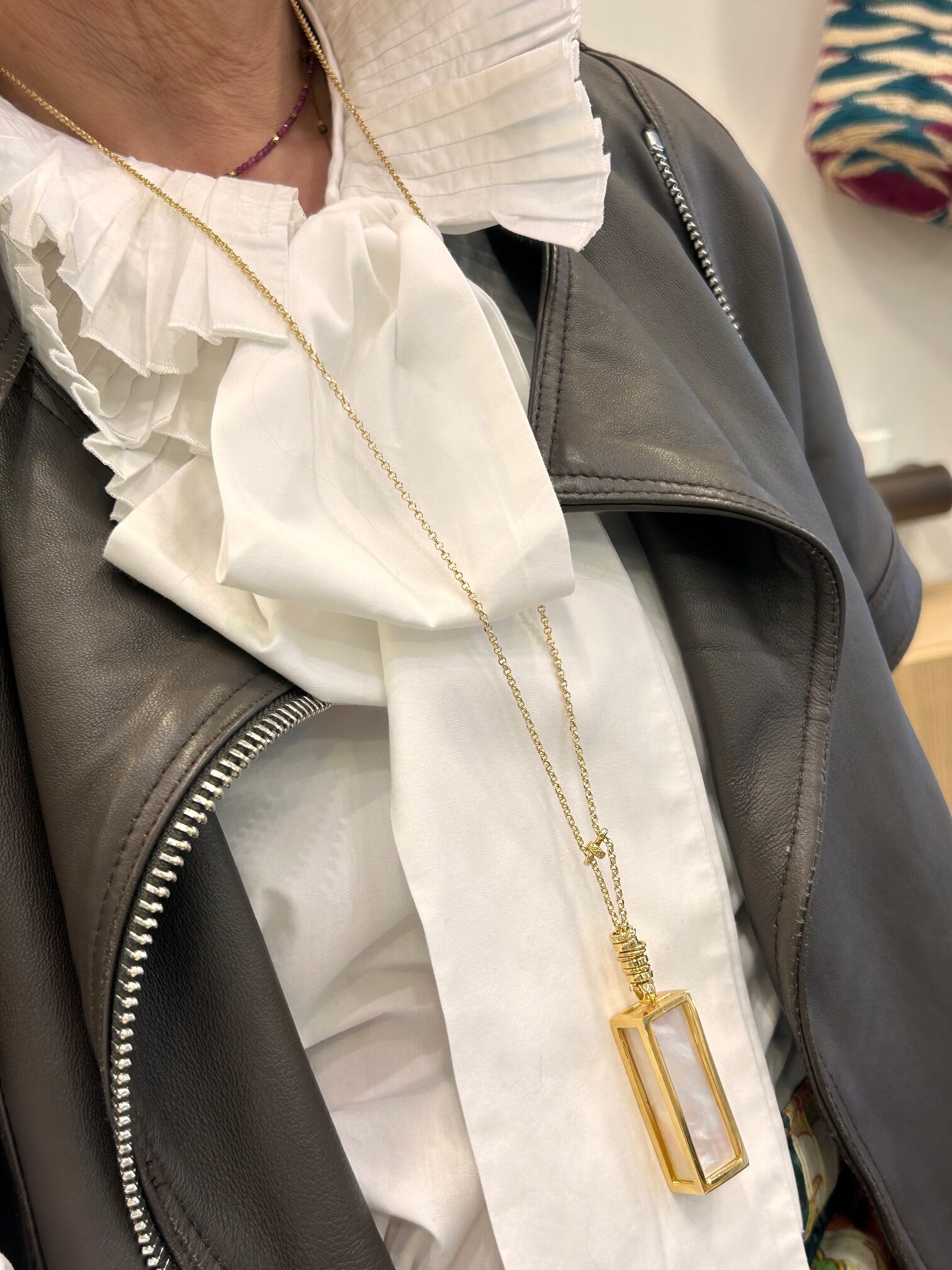 La chaîne de 76 cm allonge la silhouette avec finesse. De plus, sa finition dorée à l’or fin capte subtilement la lumière. Le pendentif, aux dimensions harmonieuses, ajoute une touche artistique. Cependant, il reste facile à porter au quotidien comme en soirée.