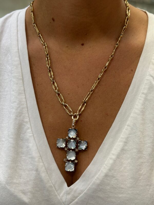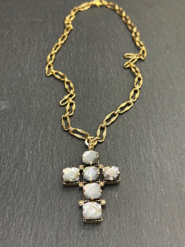 Ce collier se distingue par l’équilibre parfait entre authenticité et modernité. Les maillons martelés offrent un relief unique, cependant la croix en nacre adoucit la composition. Ainsi, le bijou devient un symbole à la fois puissant et raffiné, idéal pour magnifier une silhouette citadine ou un style plus habillé.