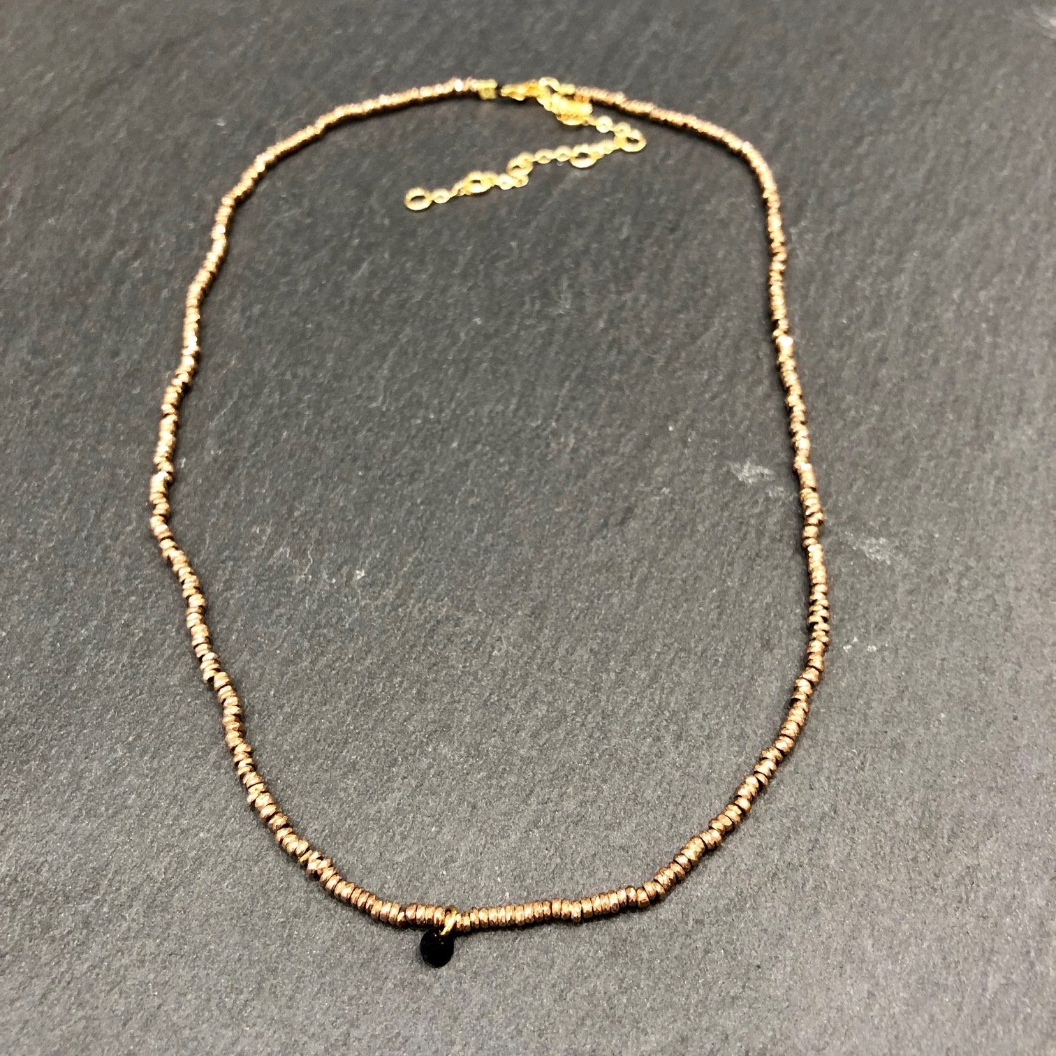 Collier Chouchou, collier court en hématites gold rose orné un cristal noir.
