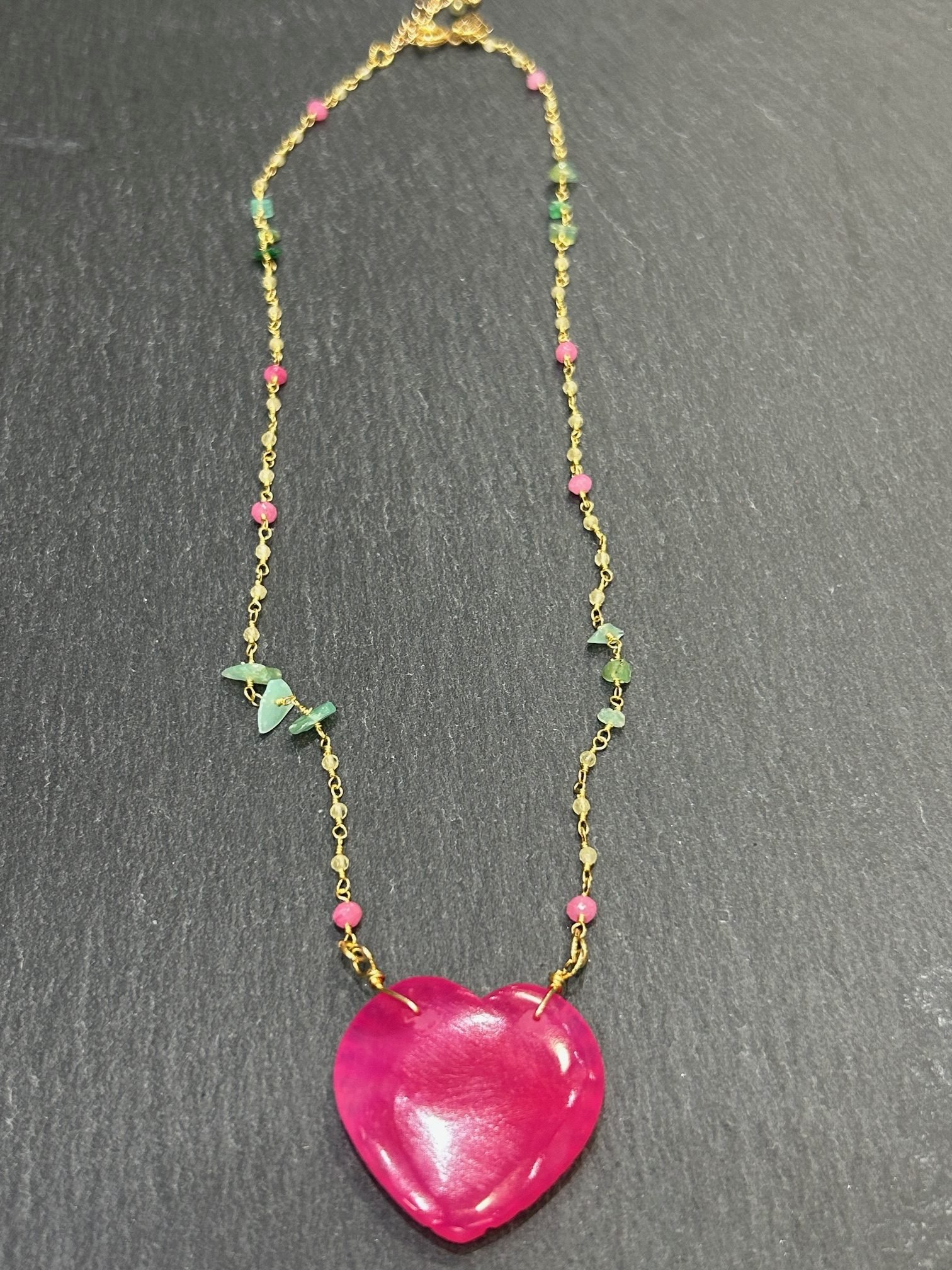 Collier court en laiton doré à l’or fin, chaine ornée de calcédoine rose et jaune et d’amazonite sublimée par un coeur central en calcédoine rose gravé sur une face.