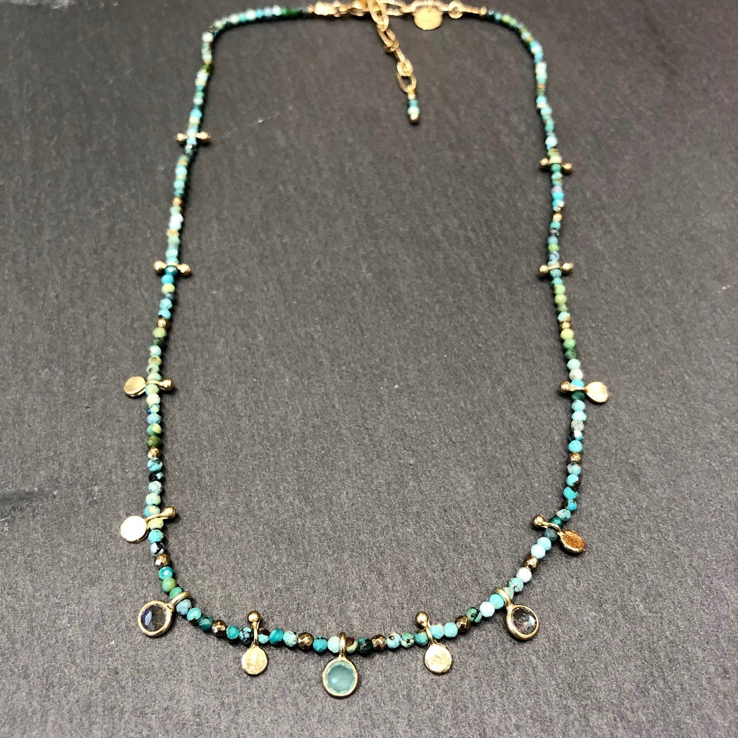 Collier court en laiton plaqué or 24 carats et pierres fines turquoise.