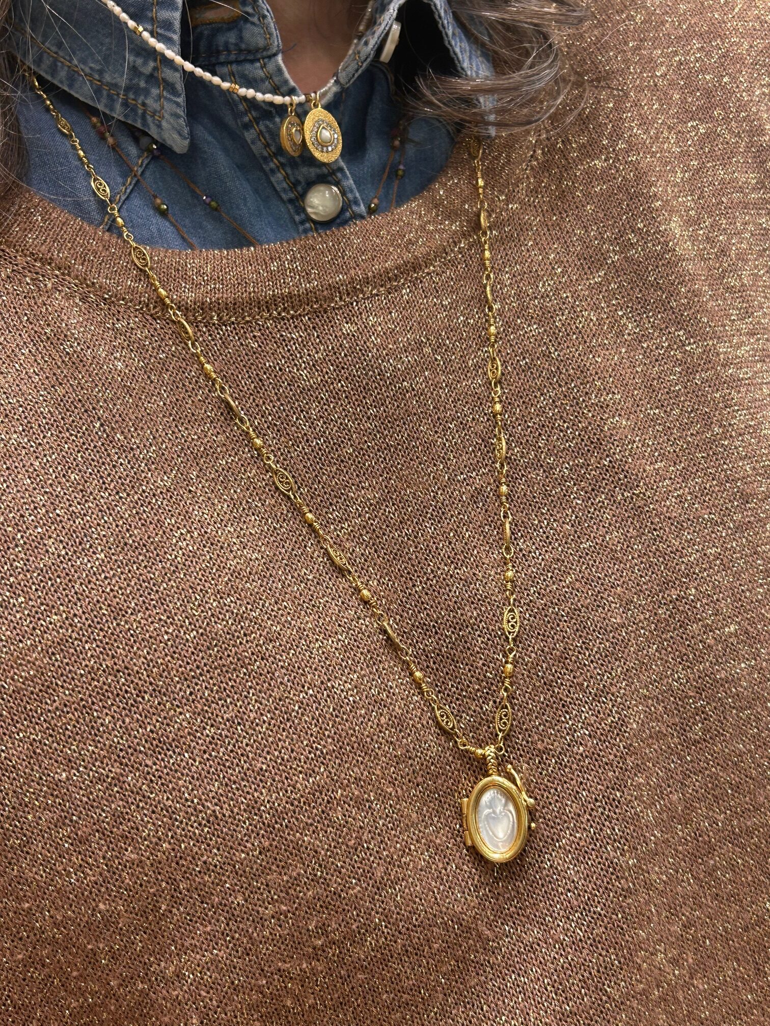 Le laiton plaqué or illumine l’ensemble avec chaleur. Cependant, la nacre reste la véritable signature visuelle du collier. Ses reflets irisés changent subtilement selon la lumière.