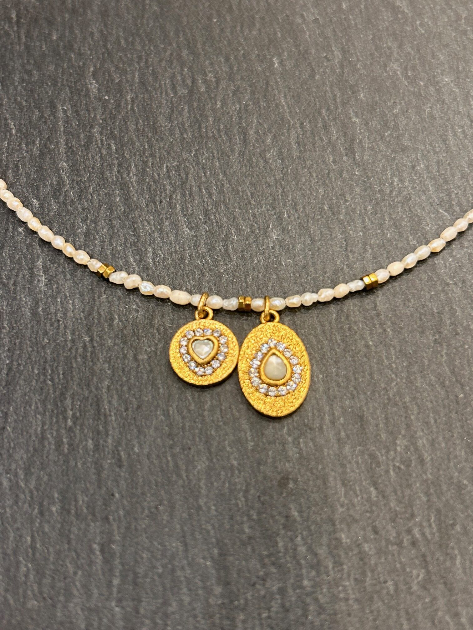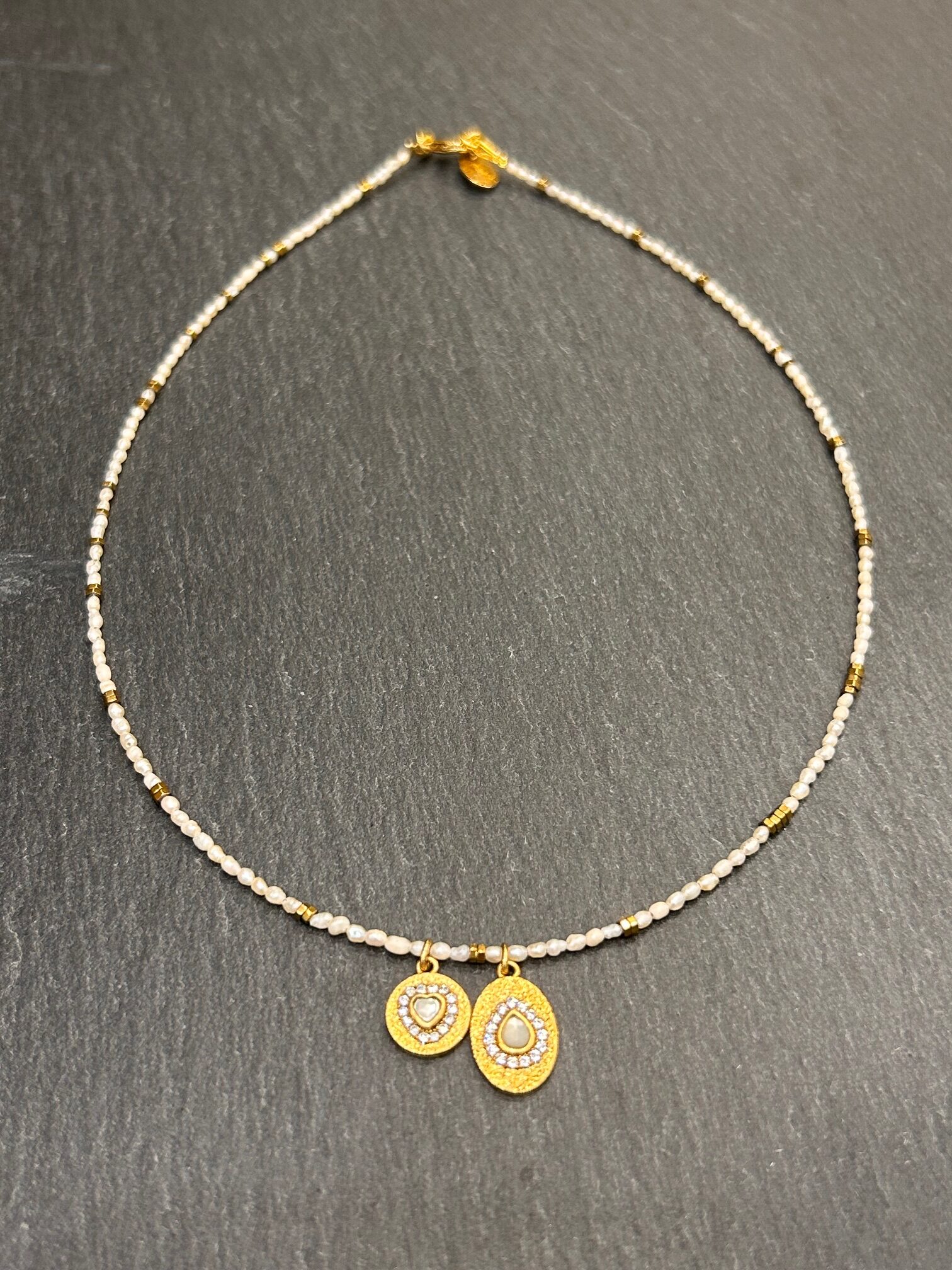 Deux médaillons décoratifs rythment délicatement le collier. Ils apportent donc un détail précieux qui attire le regard avec discrétion. Chaque élément trouve sa place dans une composition harmonieuse et équilibrée.