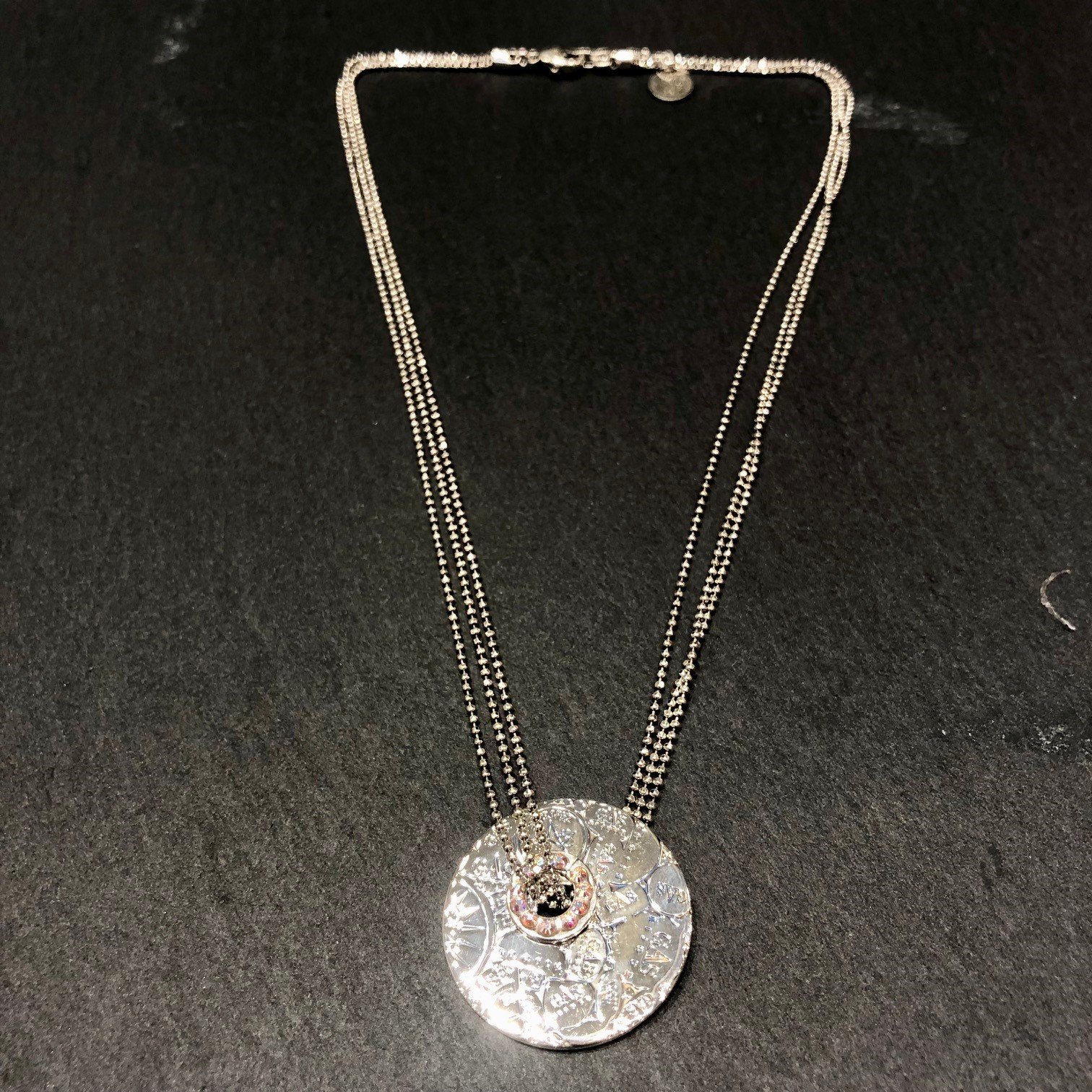 Collier court argenté composé de 3 chaines fines avec boules facetées et d’un médaillon gravé..