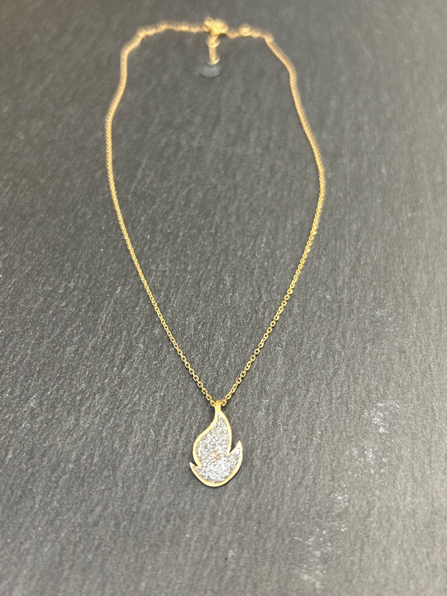 Collier court, en argent 925 plaqué or orné d’un pendentif flamme en émail diamanté couleur argent.