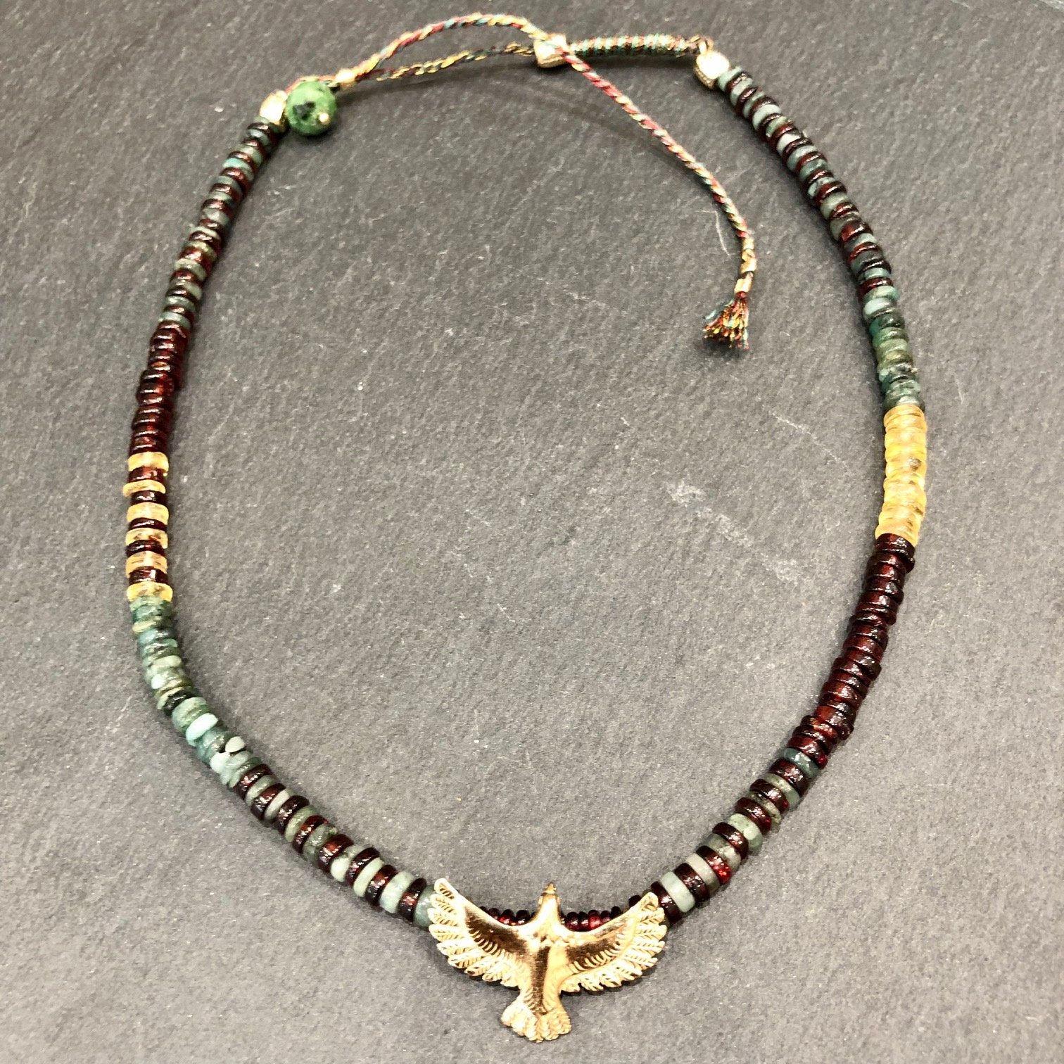 Collier ras du cou composé de disque de perle en pierre fine émeraude, grenat, citrine, orné d’un talisman aigle en agent 925 plaqué or 24 carats.