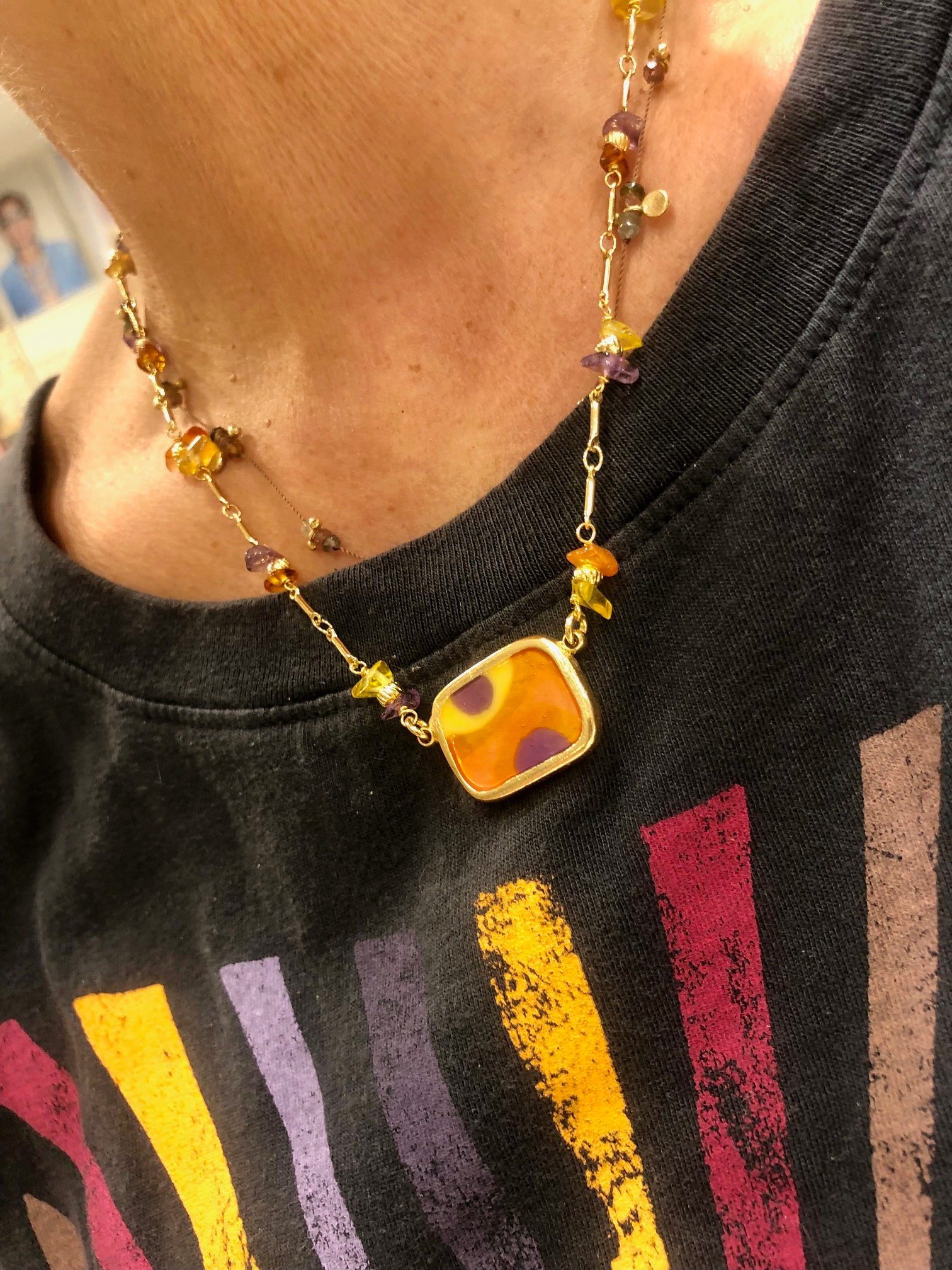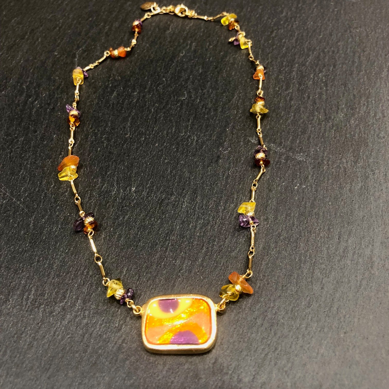 Collier court doré à l’or fin, orné d’un médaillon motifs peints et émaillés violet, orange, jaune, embelli tout du long de pierres fines.