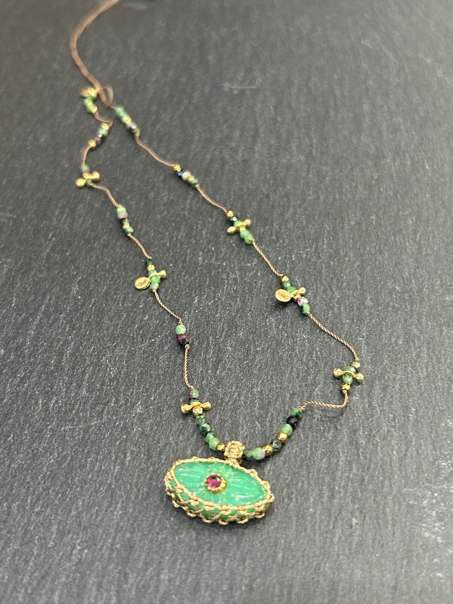 Collier habillé de rubis zoizite, d’hématite dorée et pampilles en laiton plaqué or, orné d’un pendentif oeil en chrysoprase serti avec un cabochon en grenat.