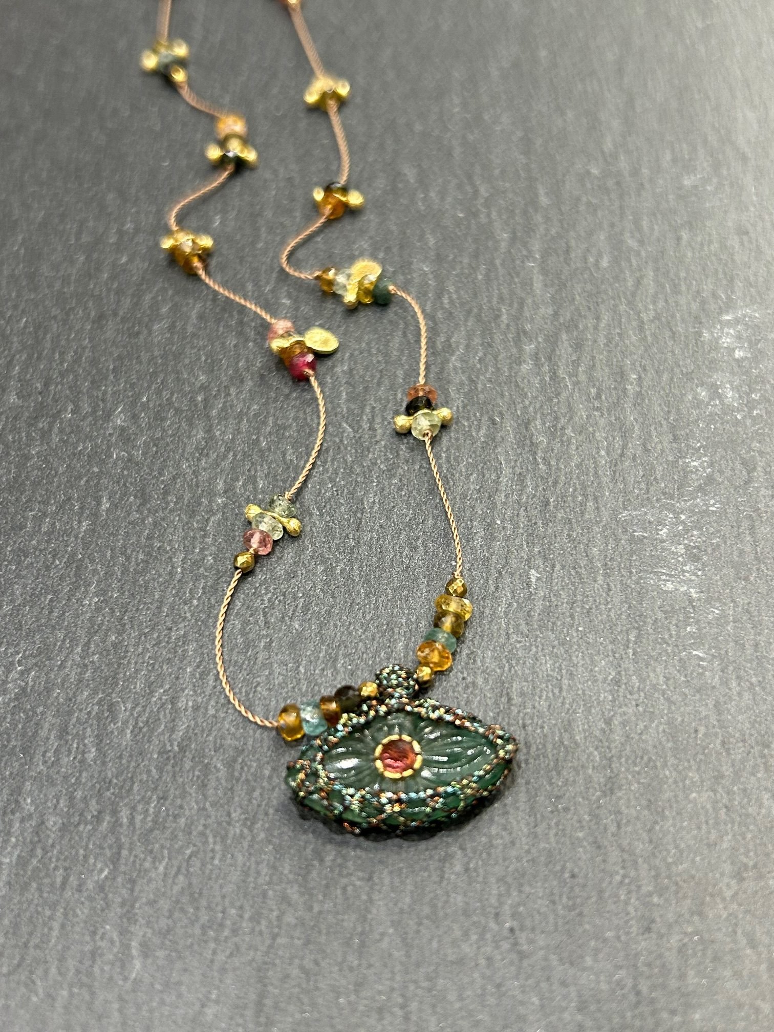 Collier habillé de tourmaline, d’ hématite dorée et pampilles en laiton plaqué or, orné d’un pendentif oeil en quartz vert serti avec un cabochon en tourmaline.