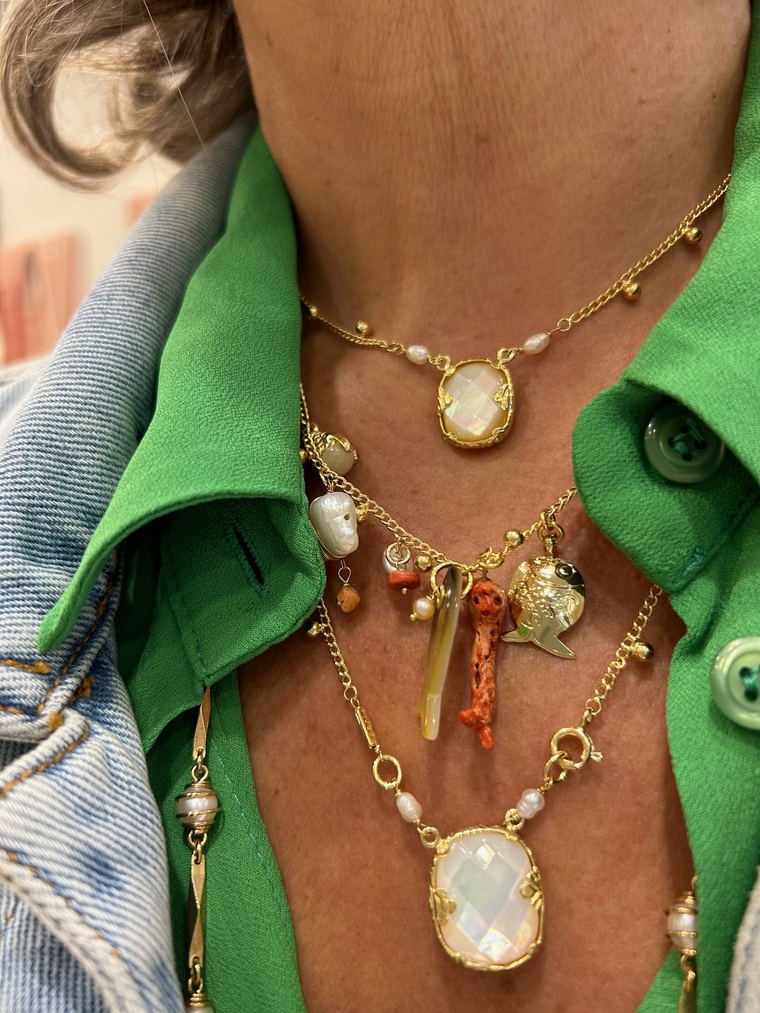 Collier court, chaine dorée à l’ or fin composée de petites boules dorées, ornée de multiples pampilles en nacre et en corail.