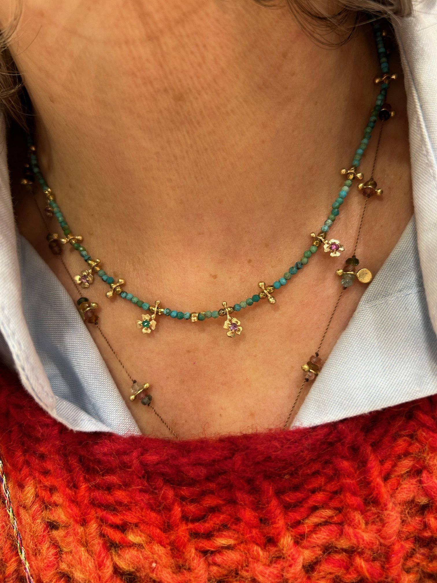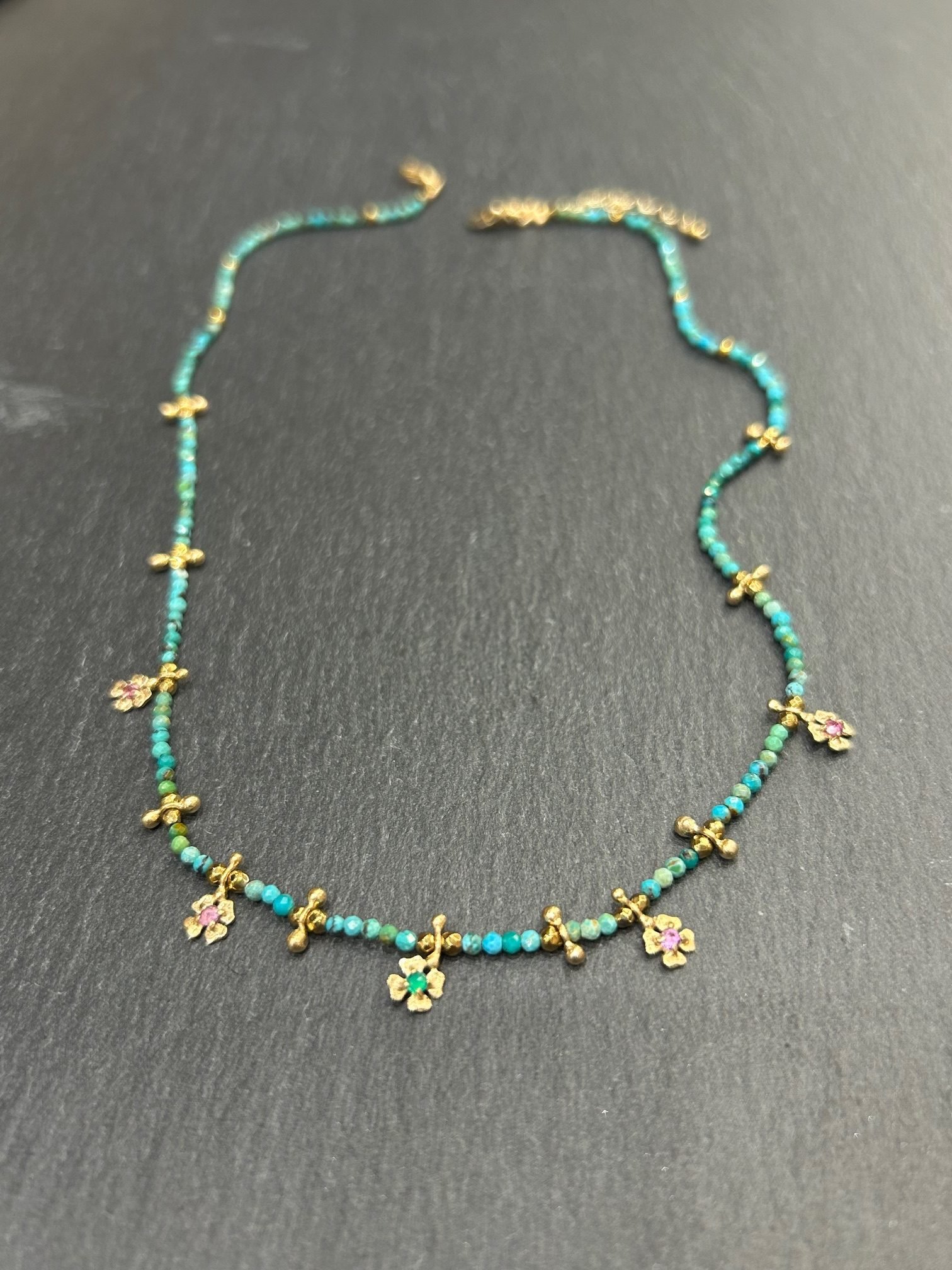 Collier ras le cou en argent 925 plaqué or 3µ en perles turquoise et hématite, orné de pampilles trefles porte bonheurs.