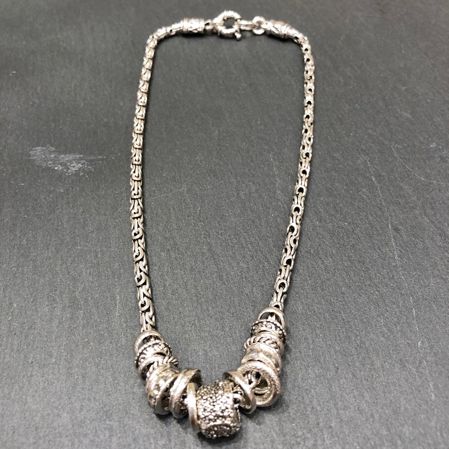 Collier court argenté orné d’une accumulation d anneaux travaillés.