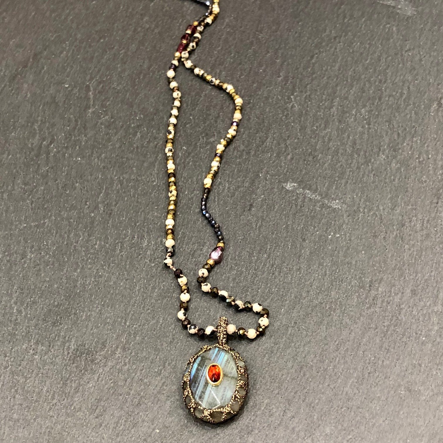 Sautoir composé de perles en pierres fines, jaspe dalmatien, pyrite, grenat et hématite, pendentif en labradorite orné d’ un cabochon en grenat.