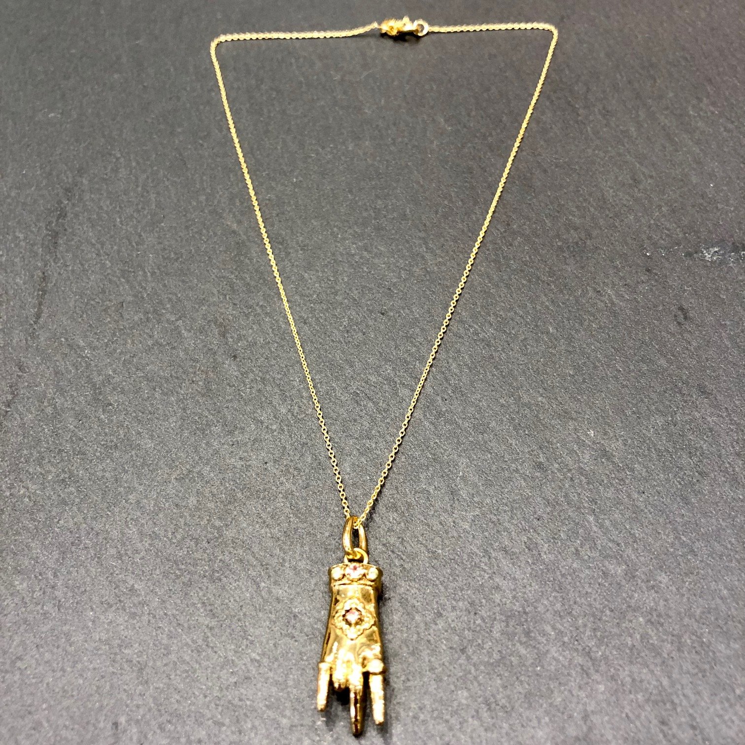 Collier court, Surya signifie Soleil, chaîne et mudra en argent 925 plaqué or 18 carats. Mudra orné de tourmaline rose,et de péridot.