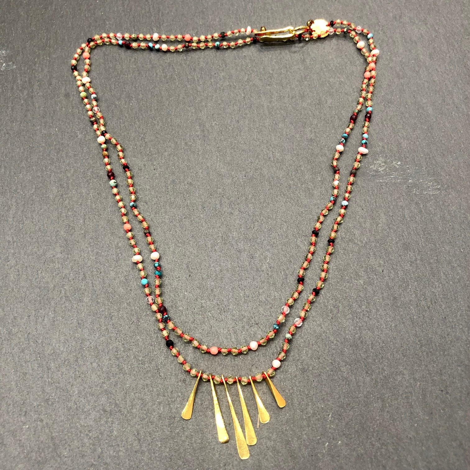 Collier 2 tours sur cordon rouge composé de petites pierres semi précieuses de couleur tourmaline, noire turquoise, rouge, perle orné en pendentif de 7 pièces dorées à l’or fin.