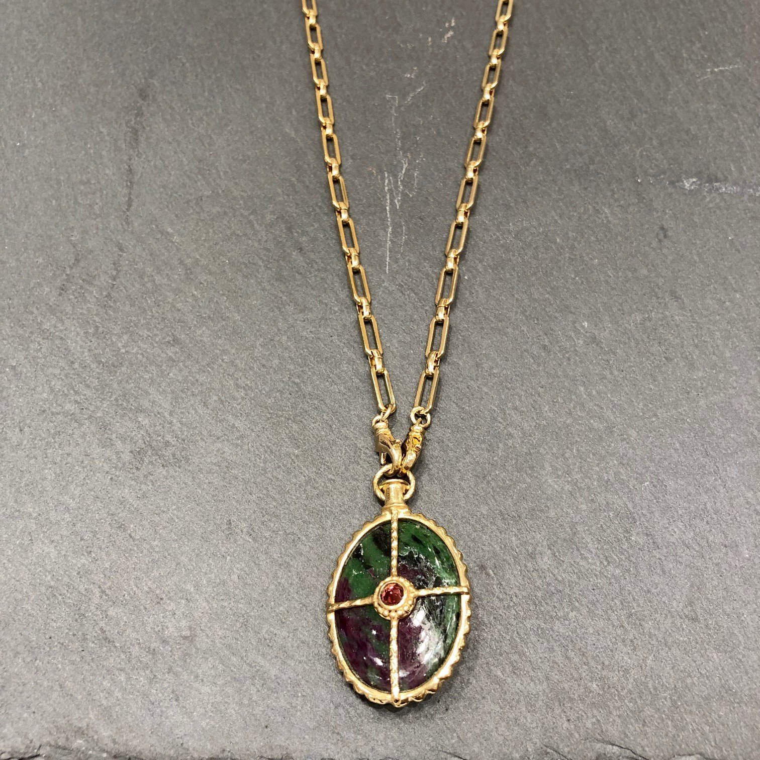 Collier sautoir en laiton plaqué or 24 carats orné d’une Rubis Zoisite.