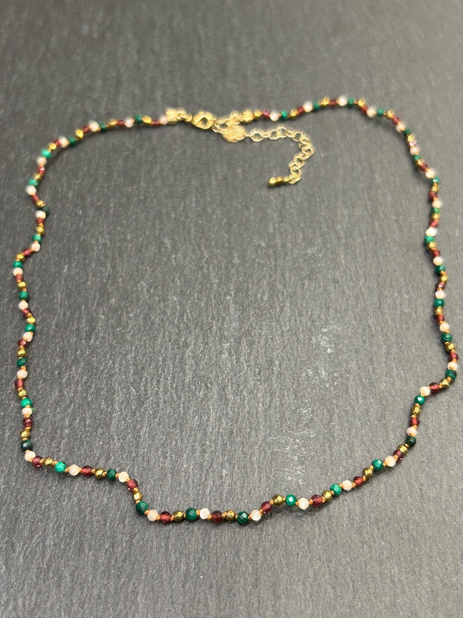 Collier court en pierres semi précieuse malachite, hématite, perle, grenat, finition laiton plaqué or.
