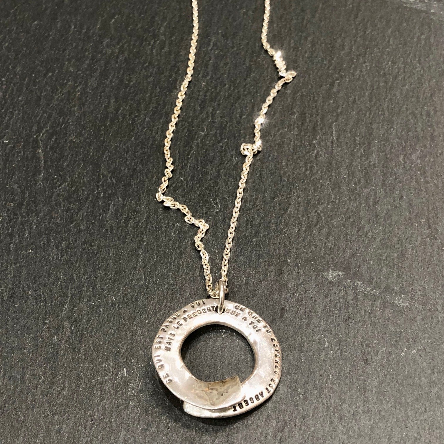 Collier en maille forçat orné d’un pendentif médaille percée en argent gravé : « Ce qui s’est passé a fui, ce que tu espères est absent mais le présent est à toi. »