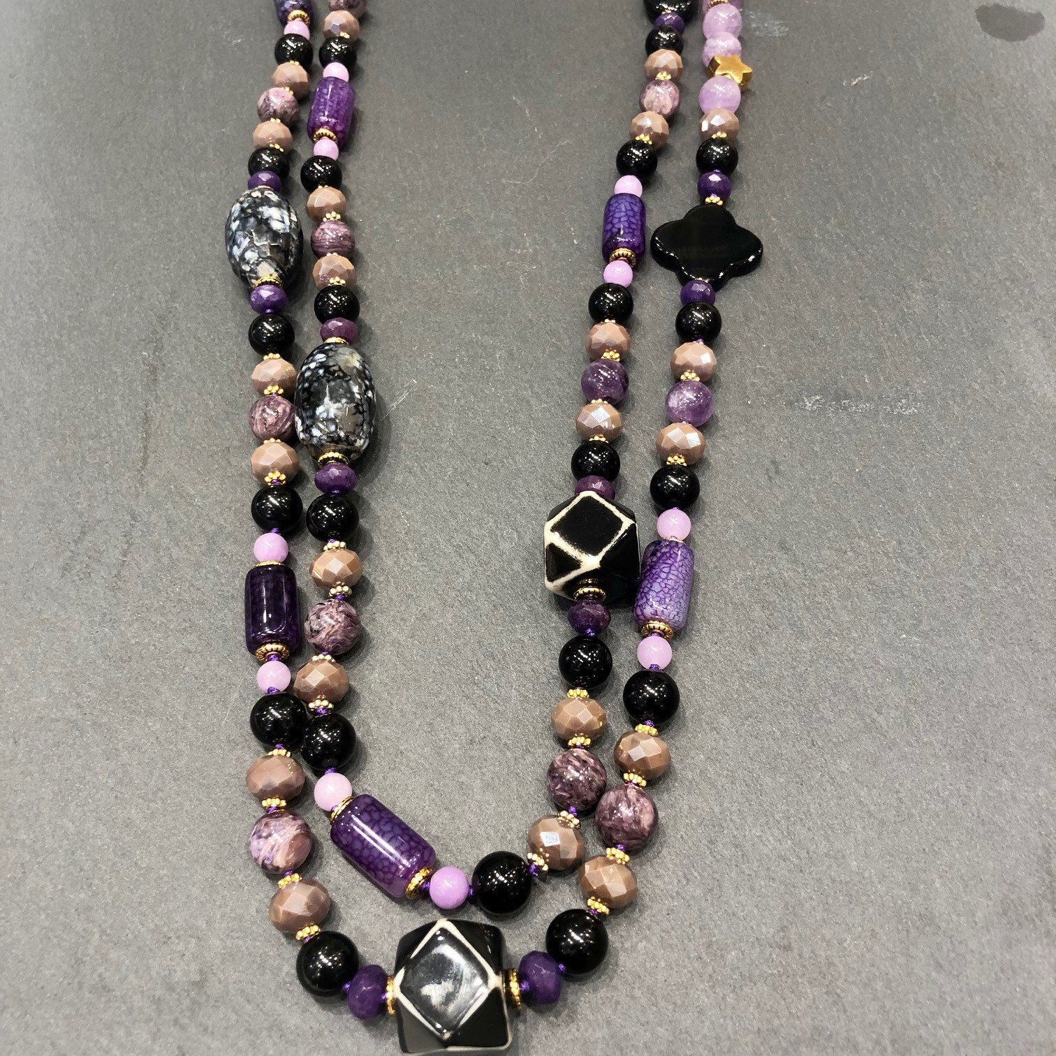Sautoir multi tours en pierre semi précieuse, composé d Améthyste, Charoite, Tourmaline, Cristal, Agate, Résine. Longueur collier 1m65