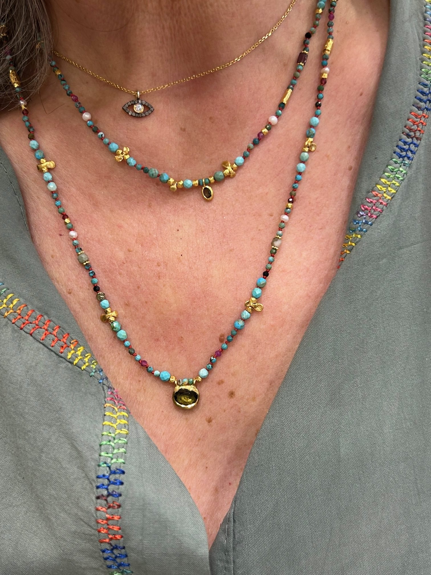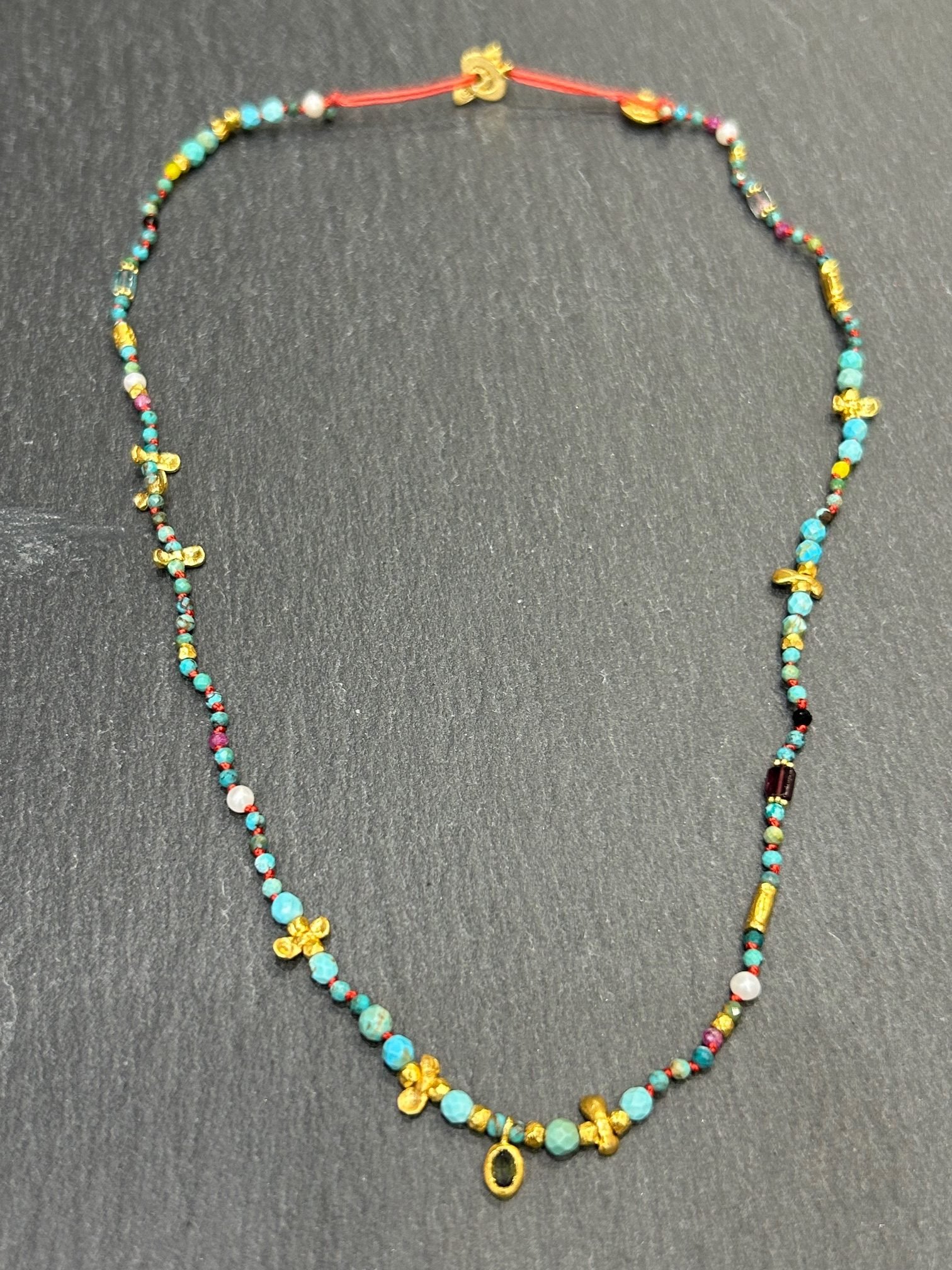 Collier court en cordon rouge orné de pierres semi précieuse turquoise nouée une à une pour en préserver la finesse et réhaussé d’un délicat cabochon en tourmaline finition argent plaqué or.