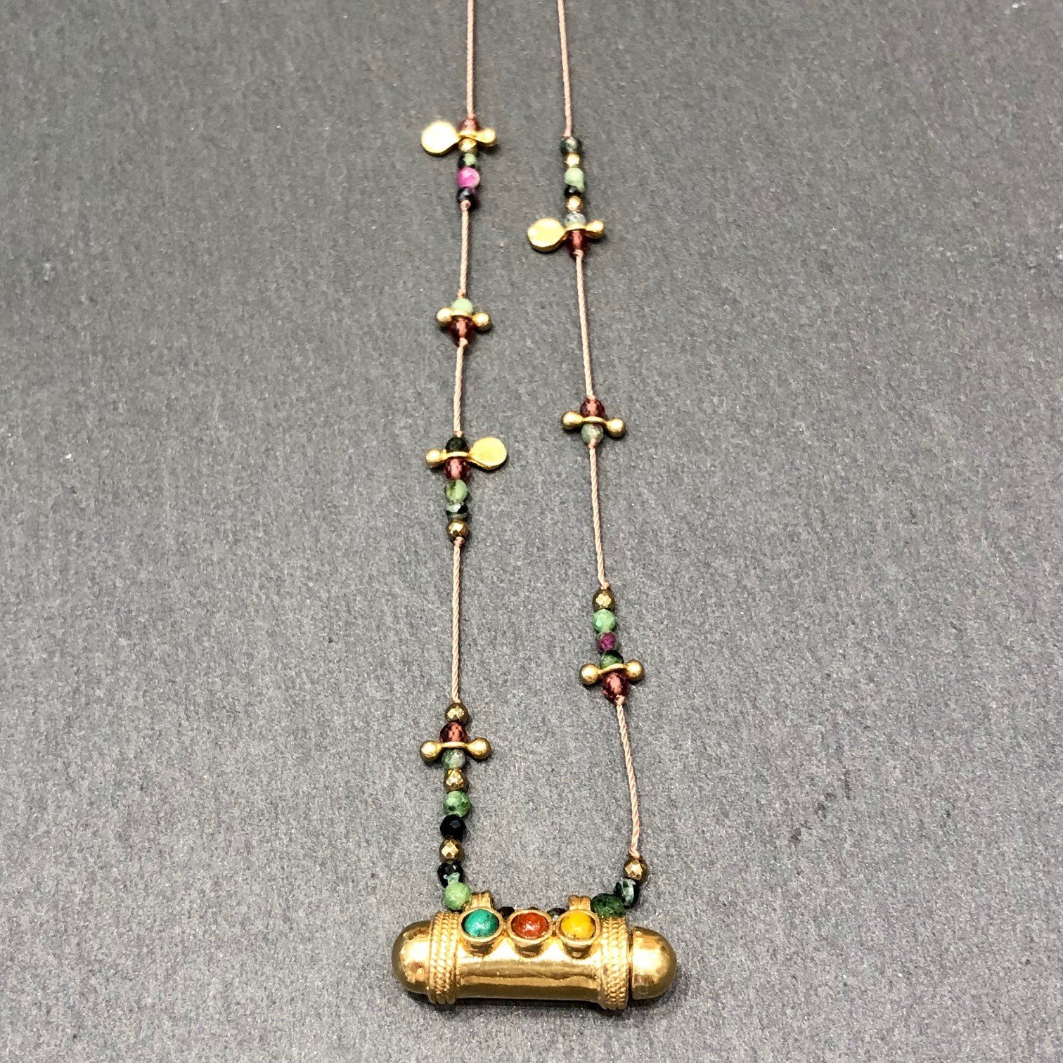 Collier en fils perlé de Rubis Zoisite, grenat et Hématite, pendentif amulette pour y glisser un voeux ou un secret, en laiton plaqué or 24 carats serti de cabochons en œil de tigre, grenat et malachite.