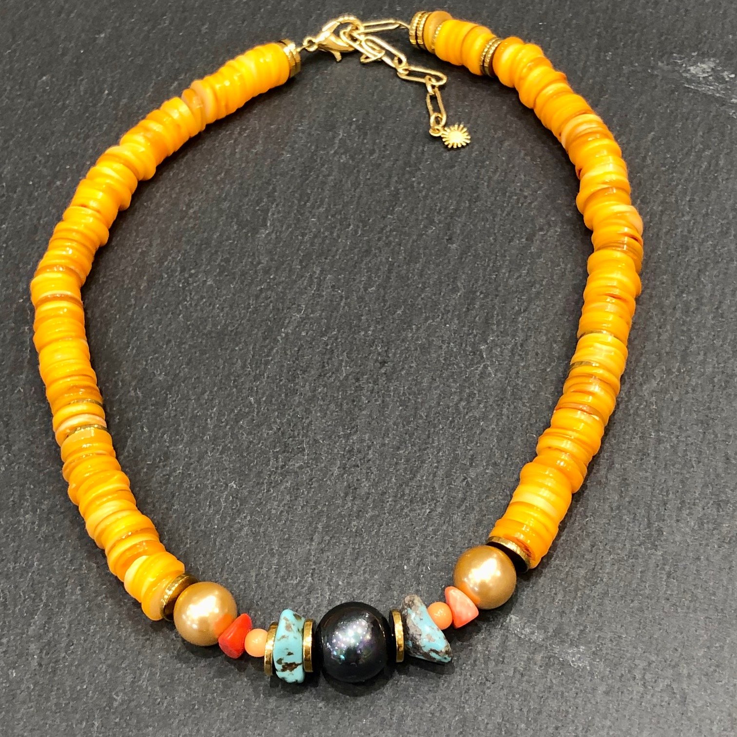 Longueur 38 cm plus 6 cm de rallonge parties métal dorées à l’or fin.
