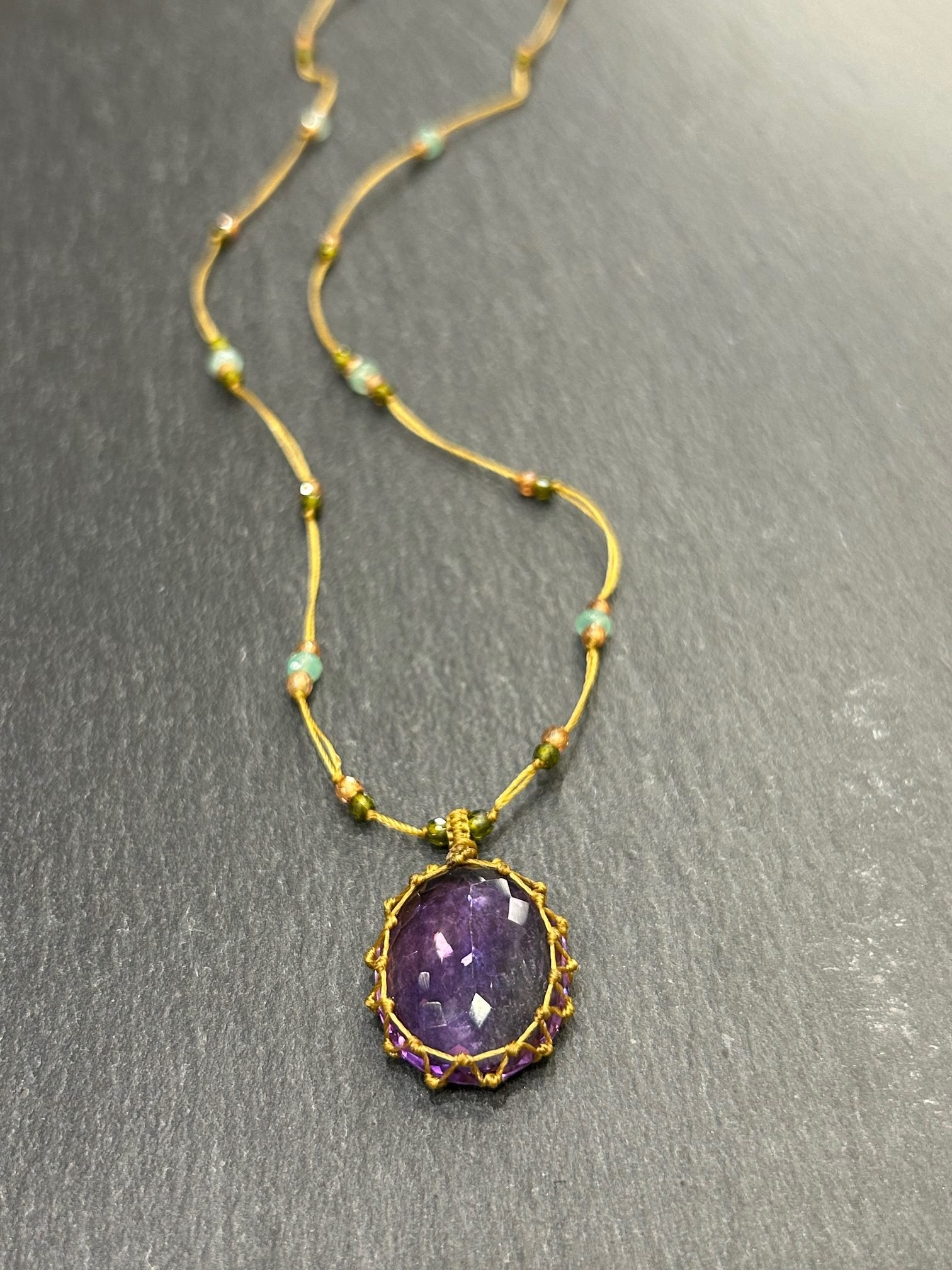 Collier court fil de soie sable orné de pierres semi précieuses, pierre pendentif améthyste.