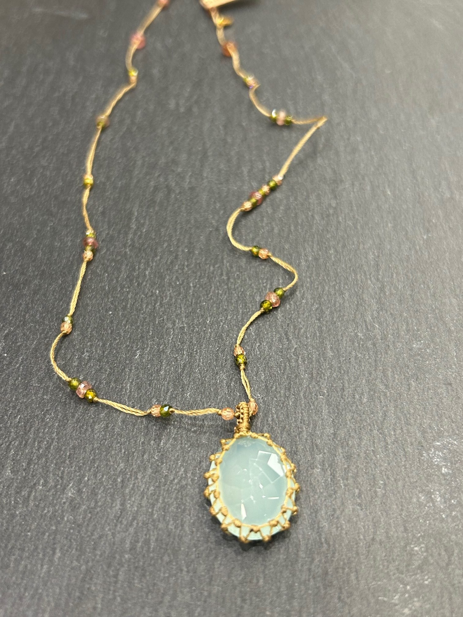 Collier court fil de soie beige orné de pierres semi précieuses, pierre pendentif calcédoine.