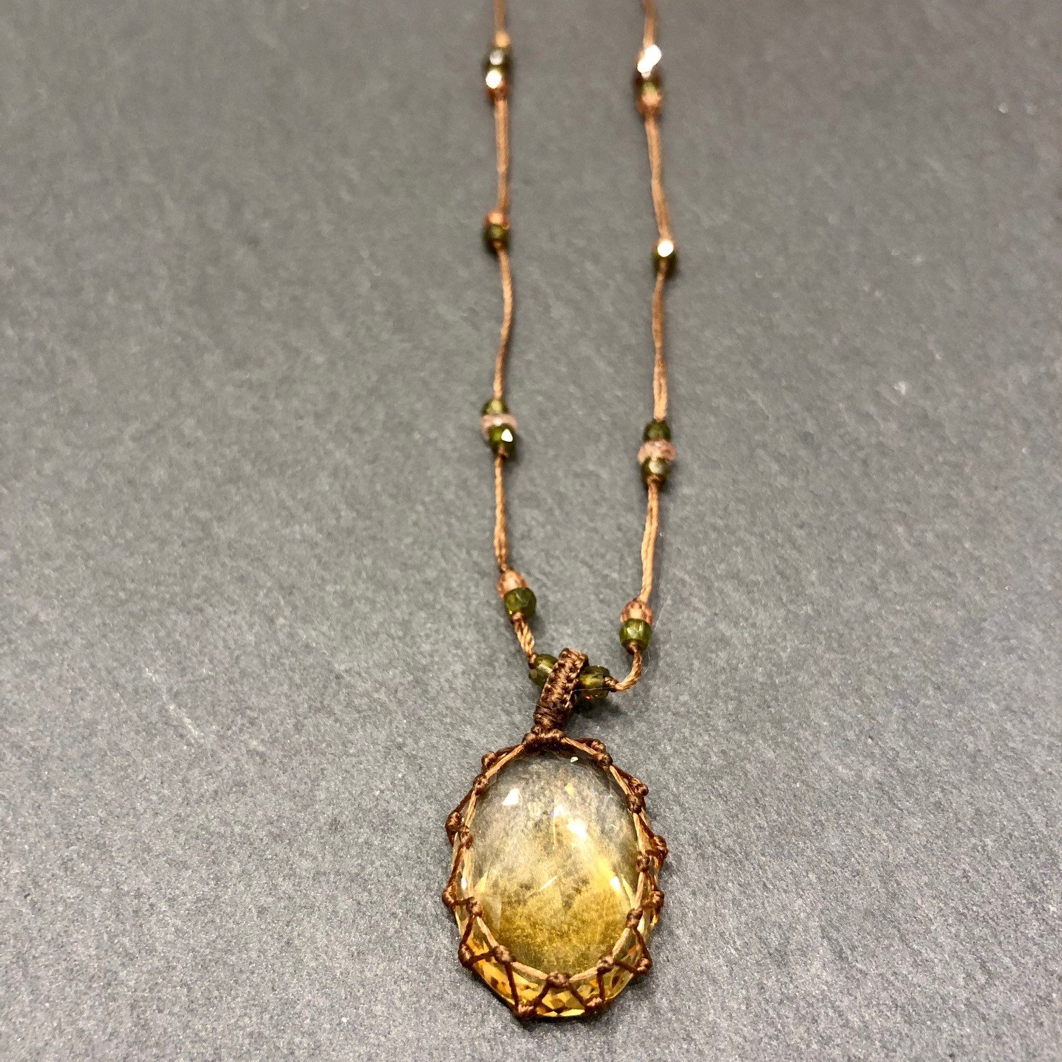 Collier court en fil de soie cognac orné de pierres semi précieuses, pendentif en Citrine.