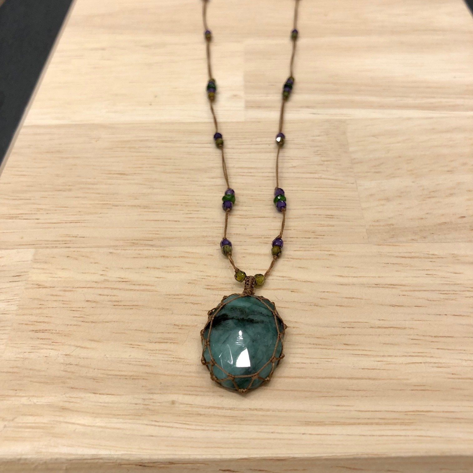Collier court fil de soie cognac orné de pierres semi précieuses, pierre pendentif Emeraude.
