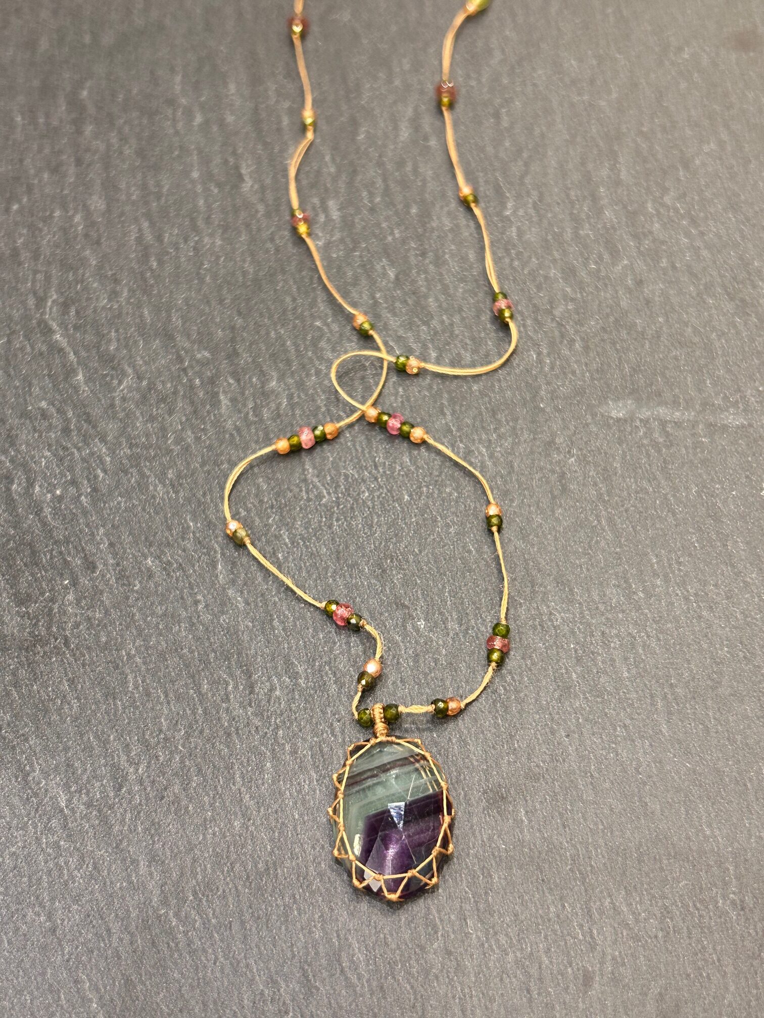 Le fil résistant coloris sable structure le bijou avec sobriété. Il crée une base chaleureuse et naturelle. De plus, les perles de tourmaline ponctuent l’ensemble avec finesse. Chaque détail s’équilibre avec précision. Par ailleurs, la fluorite rainbow révèle des reflets changeants, toujours élégants, jamais excessifs.
