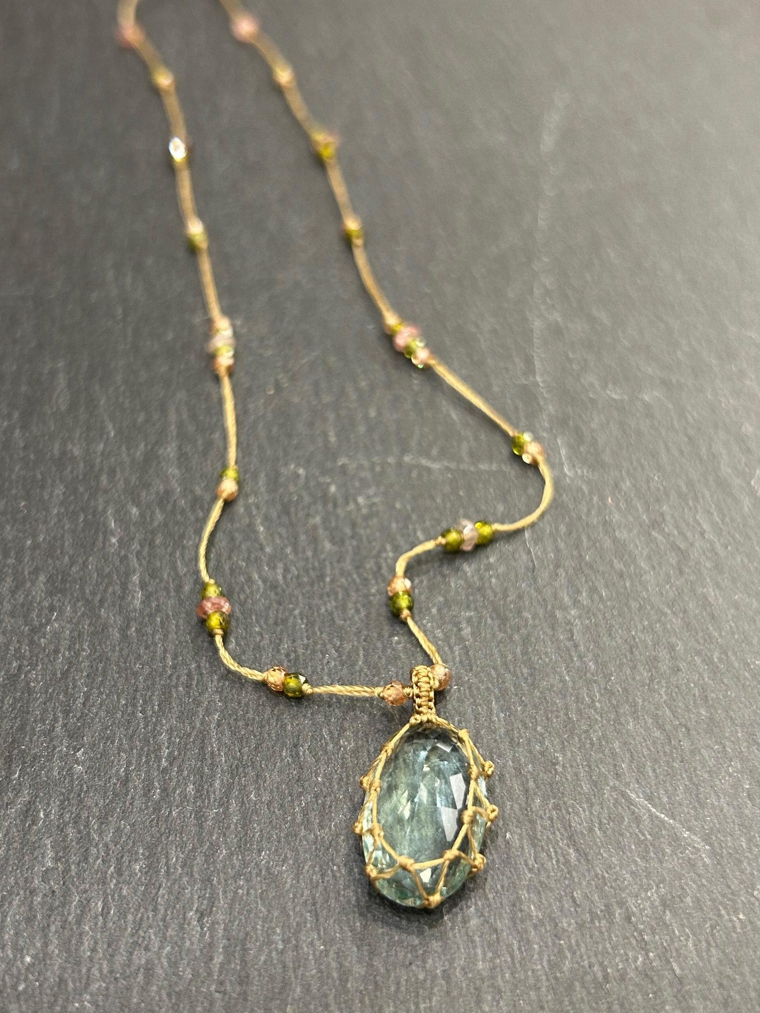 Collier court fil de soie sable orné de pierres semi précieuses, pierre pendentif fluorite verte.