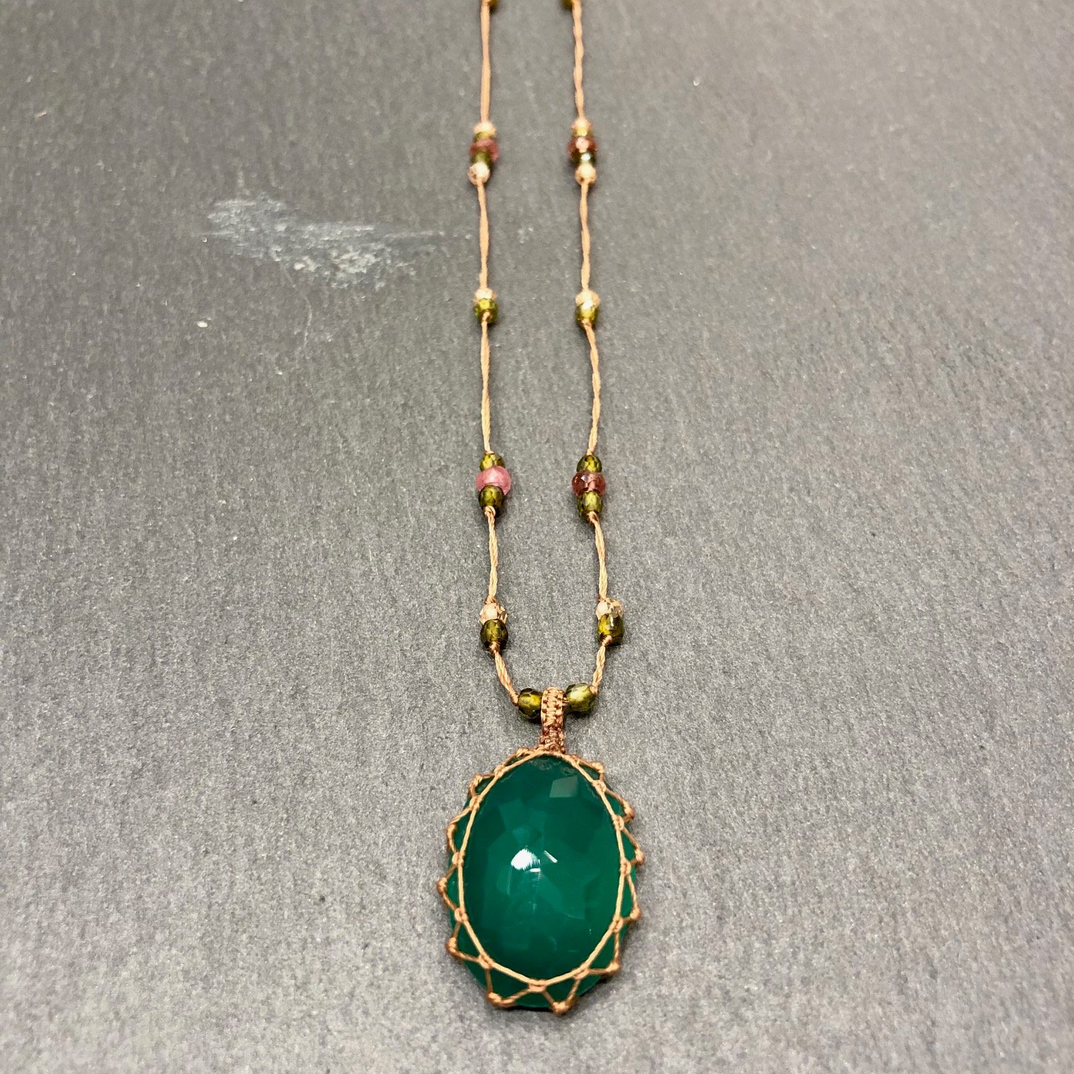 Collier court fil de soie beige orné de pierres semi précieuses, pierre pendentif Green Onyx.