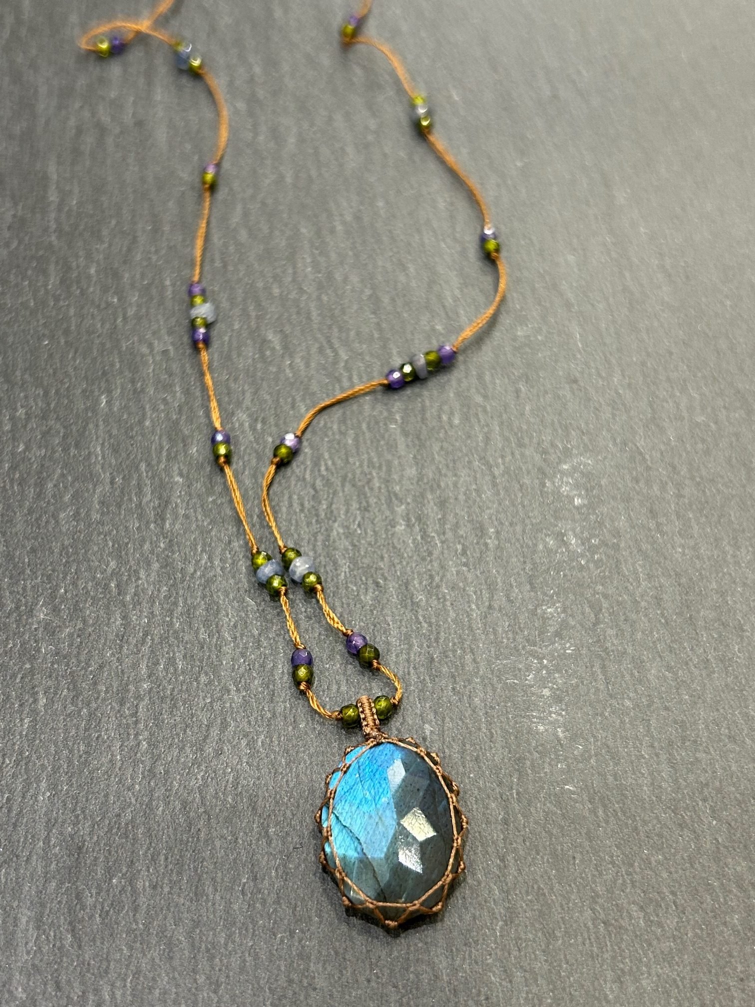 Collier court fil de soie cognac orné de pierres semi précieuses, pierre pendentif labradorite.
