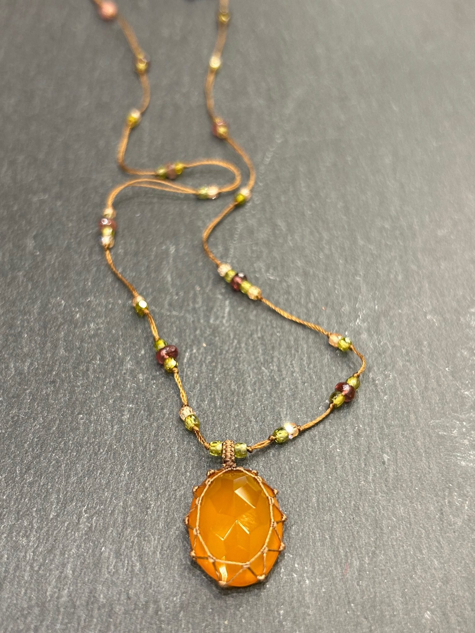 Collier court fil de soie cognac orné de pierres semi précieuses, pierre pendentif onyx orange.