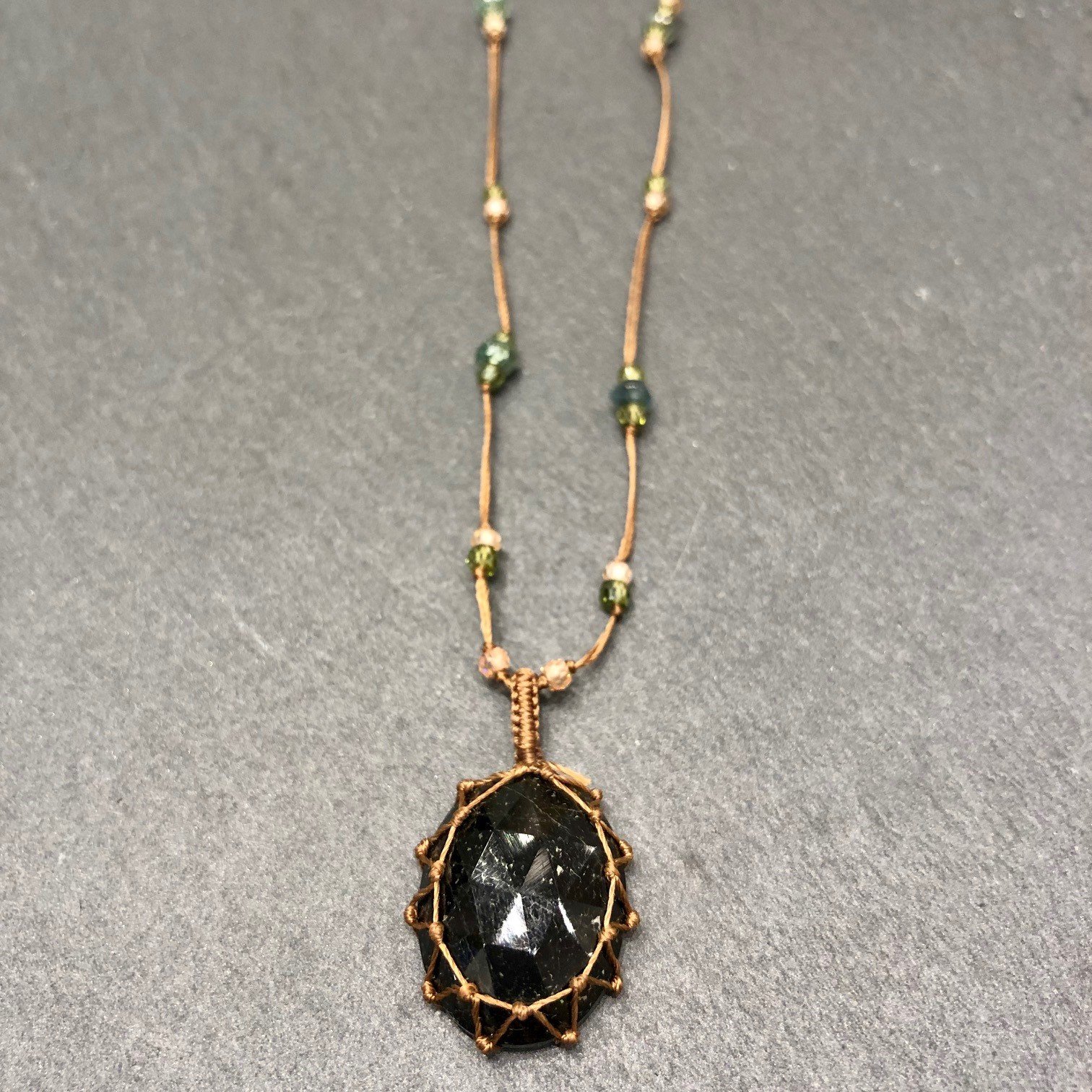 Collier court en fil de soie sable orné de pierres semi précieuses, pendentif en Onyx.