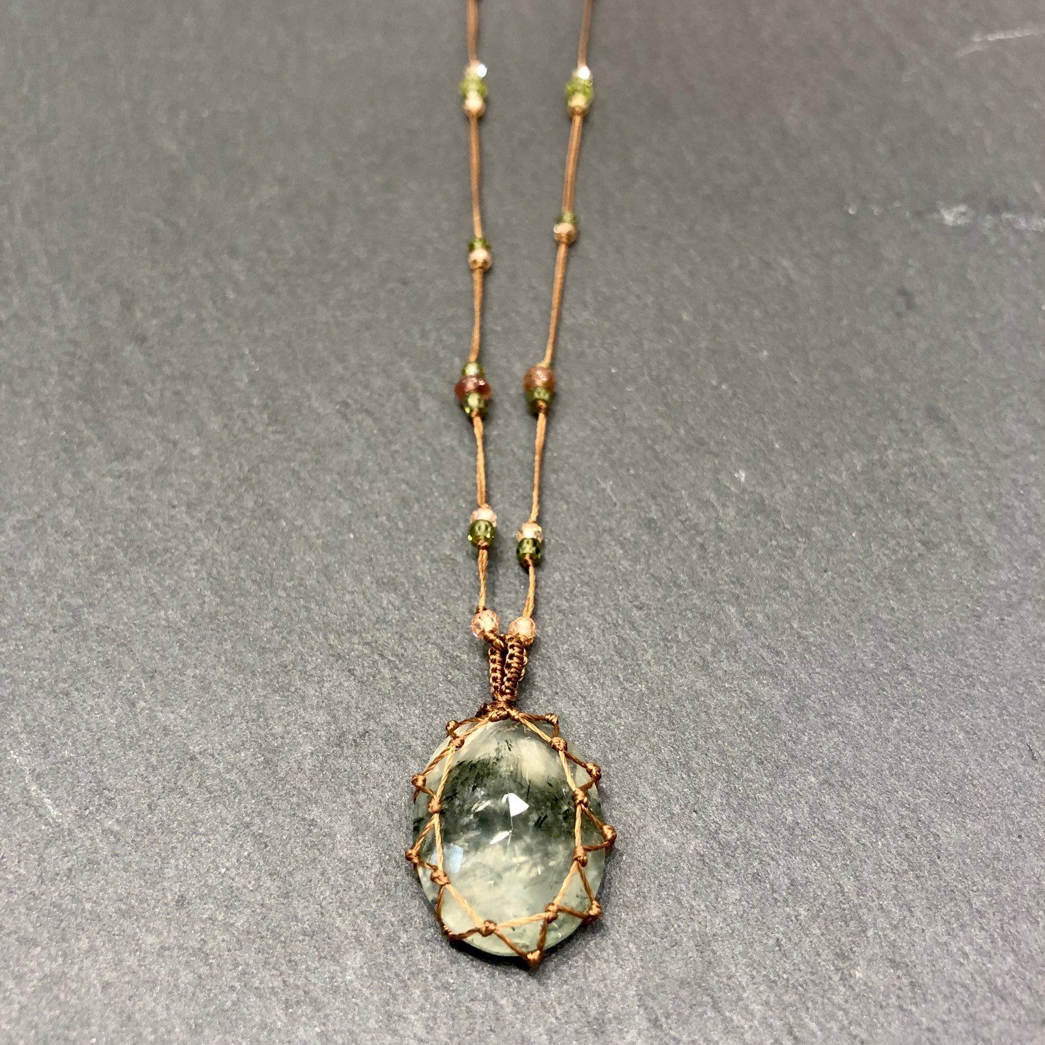 Collier court fil de soie cognac orné de pierres semi précieuses, pierre pendentif Prehnite