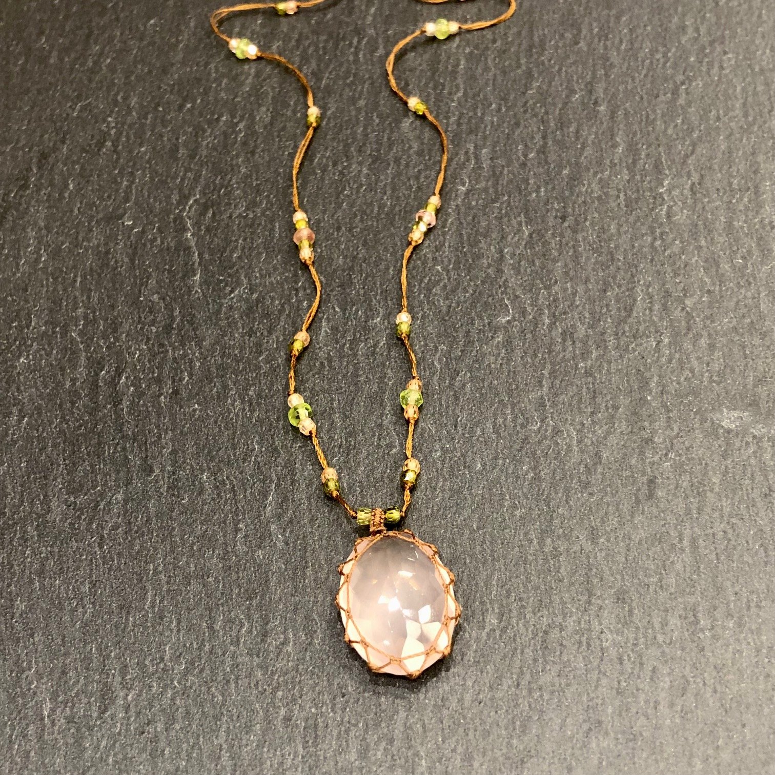 Collier court fil de soie cognac orné de pierres semi précieuses, pierre pendentif quartz rose.