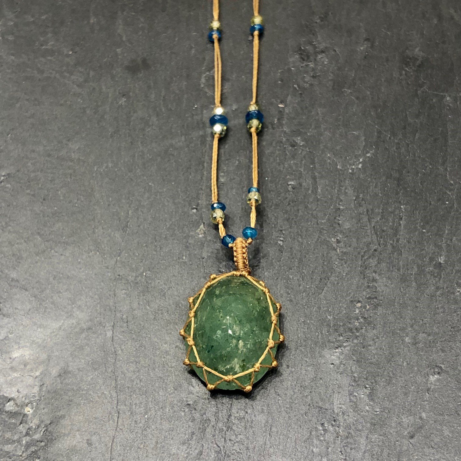 Collier court en fil de soie sable orné de pierres semi précieuses, pendentif en Quartz vert